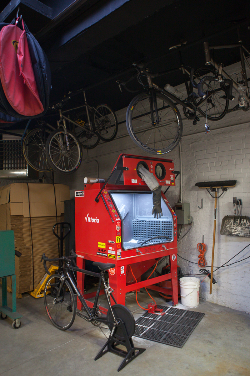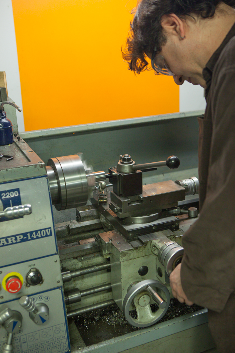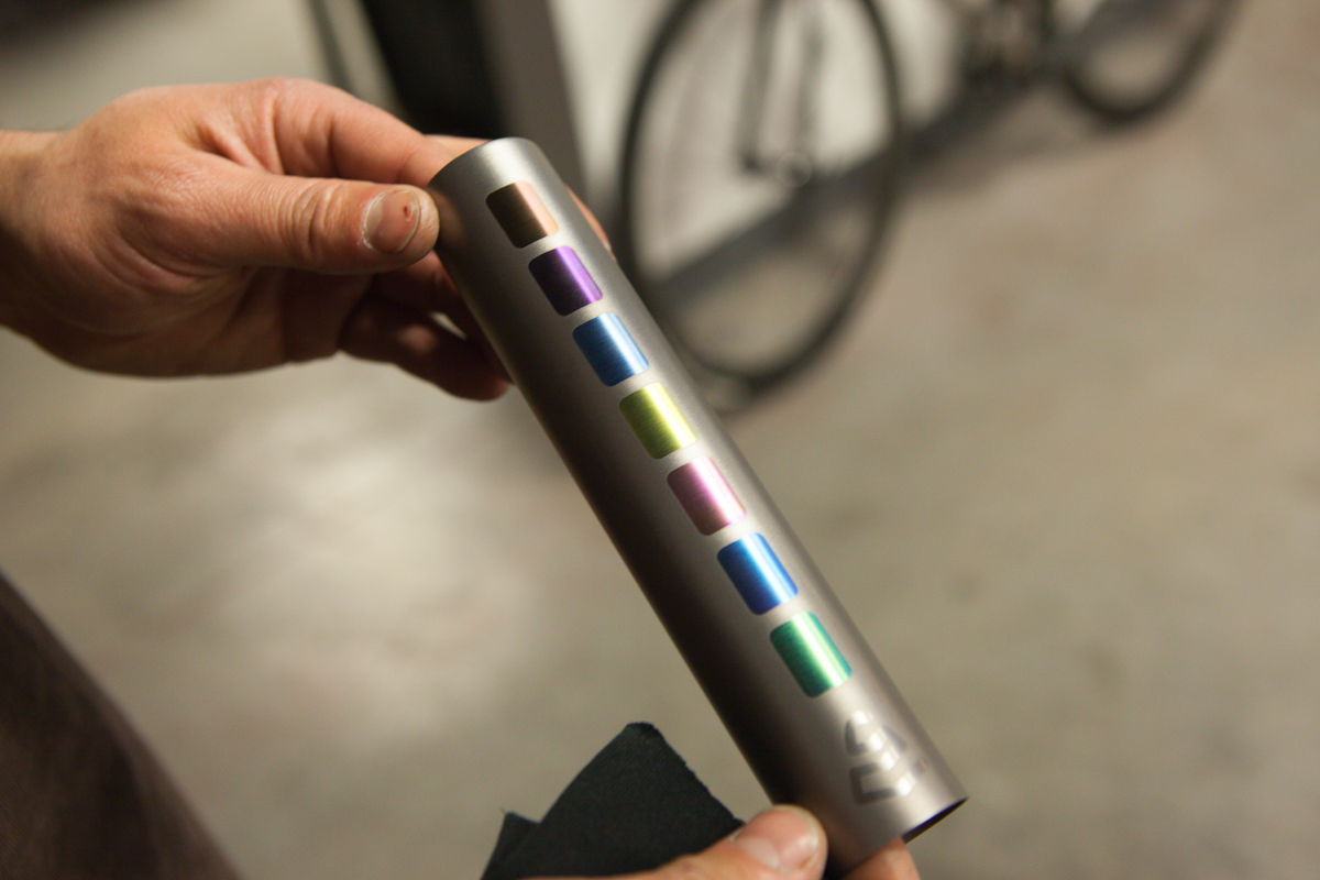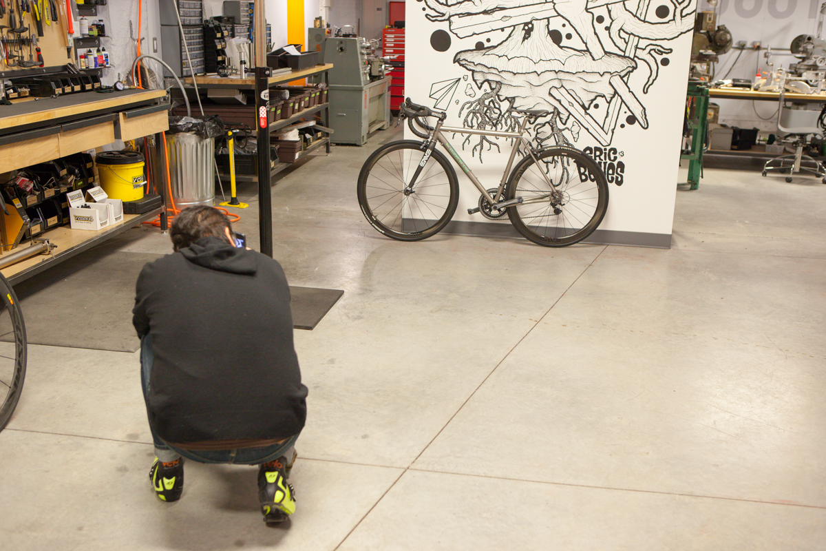 Firefly is Tyler Evans, Jamie Medeiros, and Kevin Wolfson. All incredibly smart, incredibly talented people. Jamie gave me small a shop tour as he was working on some loose ends. Jamie can be seen running the lathe, and showing me their custom anodization chart they made that shows the color spectrum they can reach. The fact that they have figured out the anodization process to this degree is absolutely insane. Not only have they mastered the color spectrum, they do it flawlessly. I was also lucky enough to be told by Tyler, “make yourself at home”, which I took as, “shoot as much as you’d like!”. Dan from Grimpeur Brother’s Coffee was in town for the Firefly Adventure Team launch, and was in house making coffee and taking photos of his loaner bike as well.