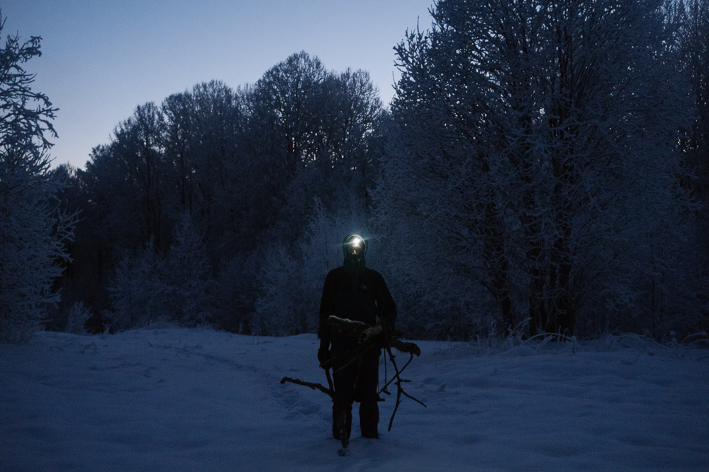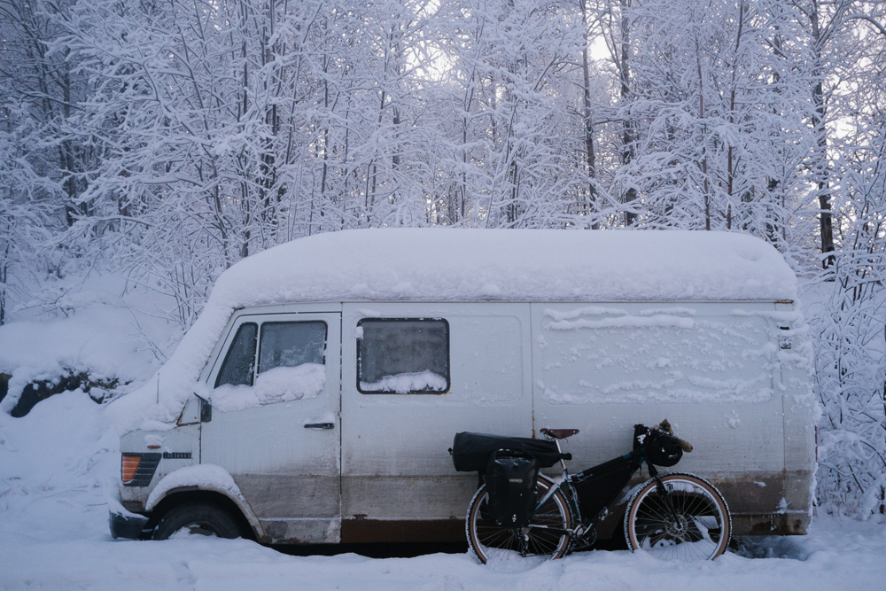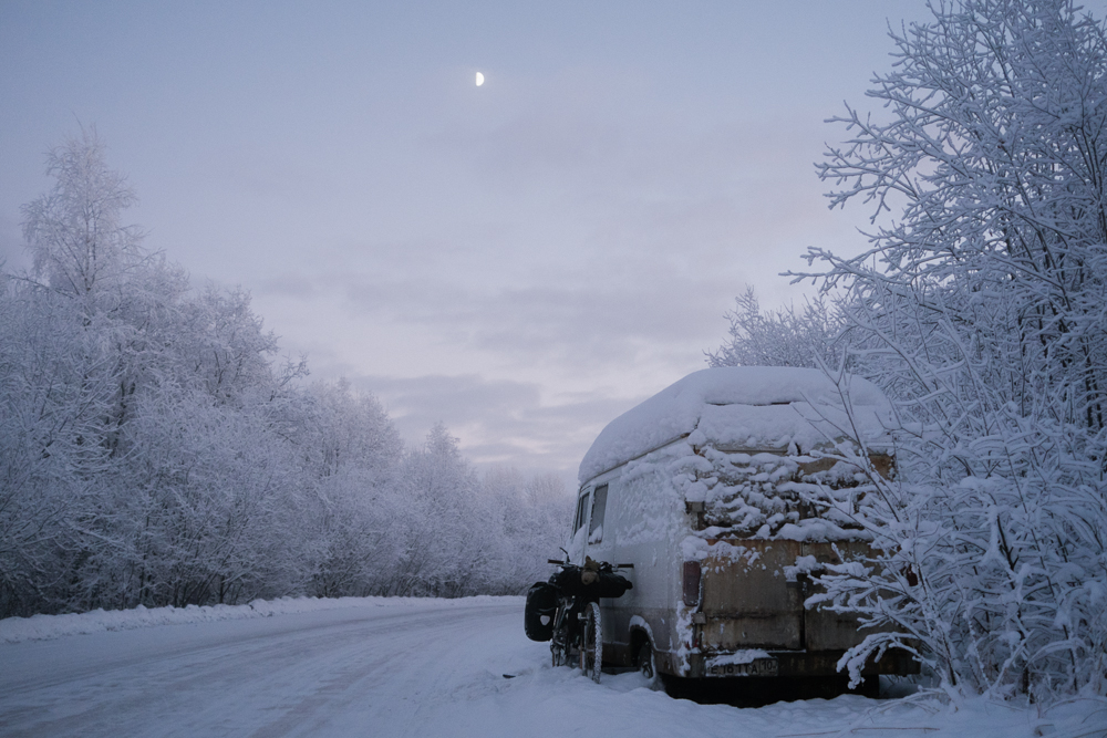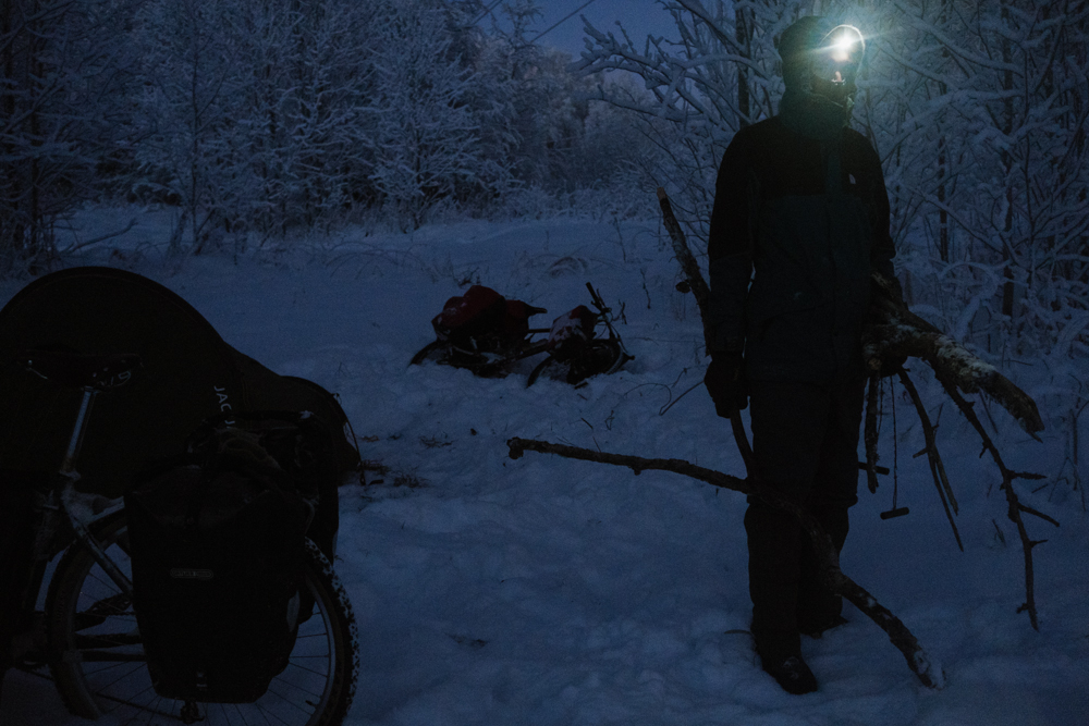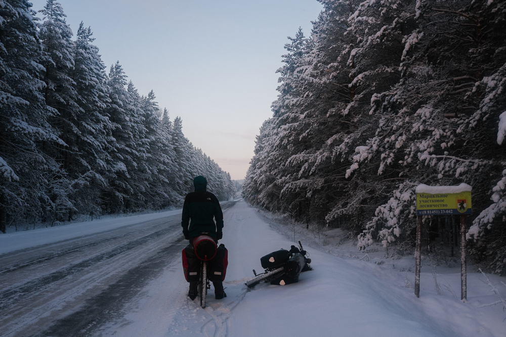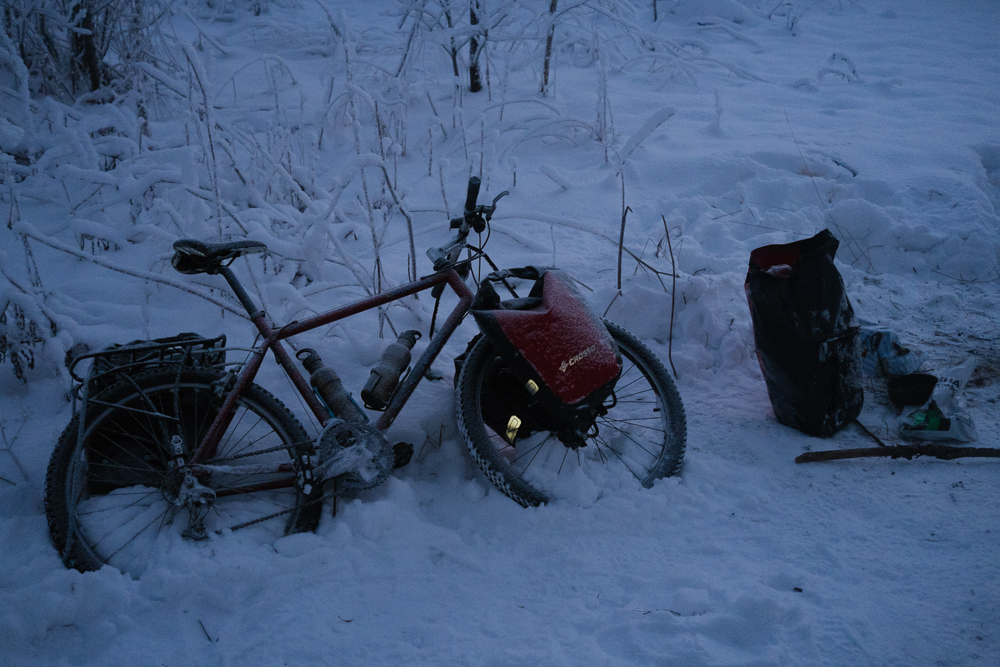 “The second night I woke up from cold and heard how benches were cracking in the forest, and the sounds came closer and closer and then something fell on the top of our tent — very loud. I freaked out and started calling Andrey, but he was still snoring peacefully. So I had to survive all this horror alone. It was the only time in my life when I actually felt this primal fear that makes you run away and never look back. But I told myself it was a big bird that just decided to sit on the tree next to our camp. And let’s imagine I run out of the tent, then what? I wouldn’t last long at that temperature anyway”.