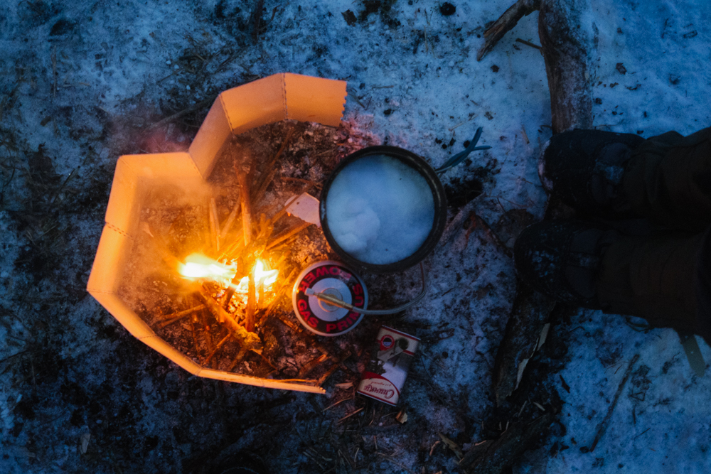 In the morning a cup of tea was enough. But the guys had serious problems with cooking. The gas camping stove they had stopped working at -5 C. So they had to warm the cylinder up in the campfire or under the cloths. But they didn’t have water — it would have frozen immediately. That’s why they were melting snow, but they say it tastes like empty water. The tea made with it was horrible, besides there was always some stuff like leaves or small branches floating. For lunch Andrey and Alexander usually had bulgur with vegetables or lentil soup, delicious but simple meal.