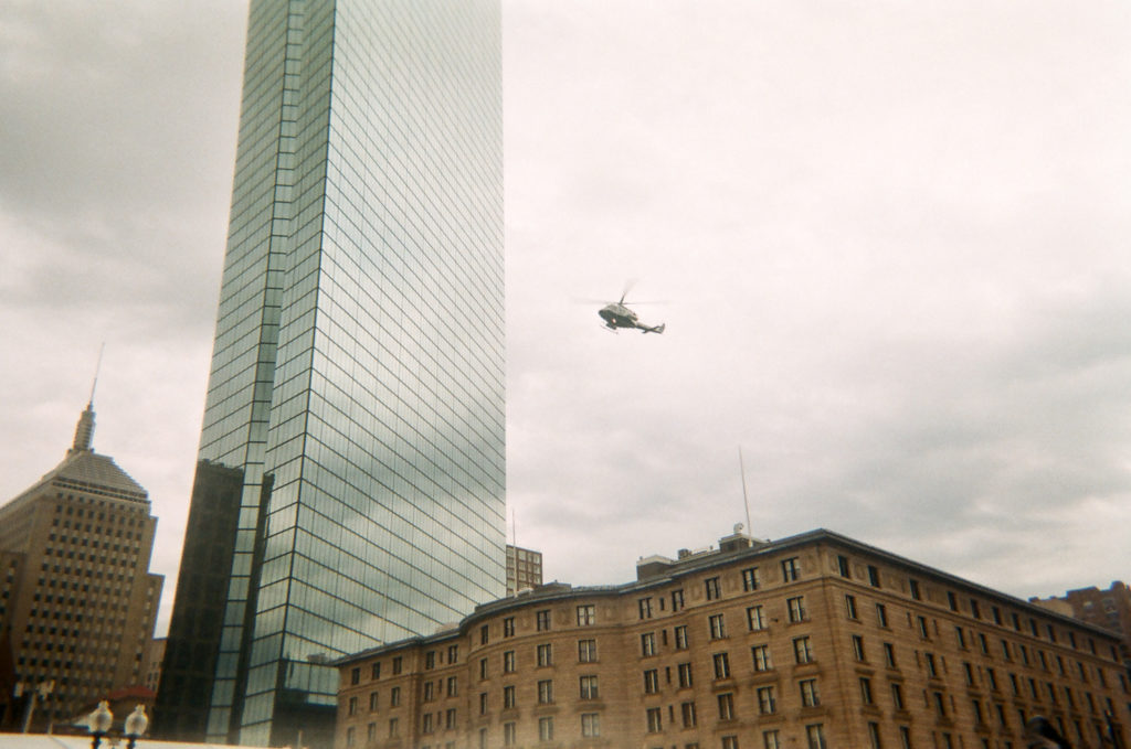 3 – The week before the Boston Marathon police conduct a search for radioactive bomb material by flying helicopters in grid patterns over the city. The choppers fly super low and catch you off guard when they speed in between the tall buildings.