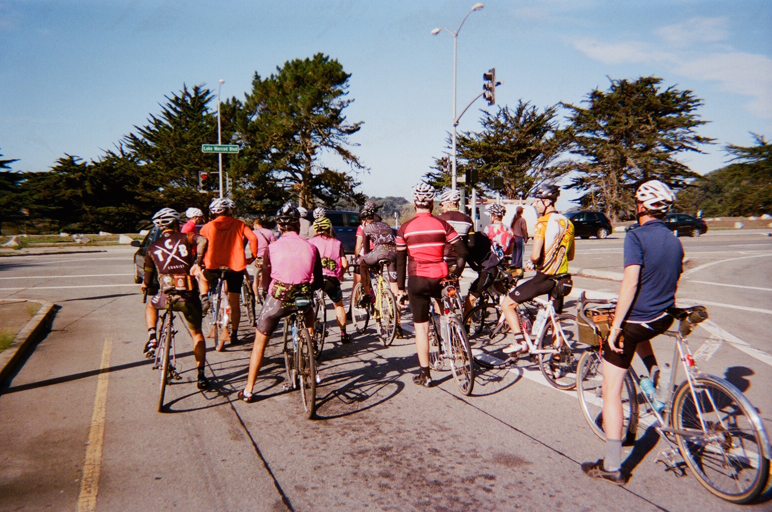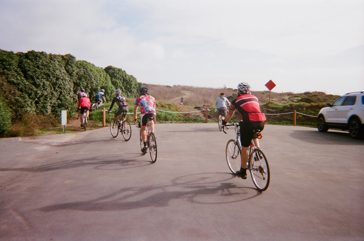 The ride departed from Box Dog Bikes’ Mission shop a bit after 9am and headed south at a chill pace. We hit our first dirt in San Mateo and climbed our first stairs of the day, ascending to Sweeney Ridge. Inconveniences such as hiking in road cleats, afternoon obligations, and severe taco hunger led a few riders to peel off at this point, but the remaining 25-or-so riders stuck together the rest of the day. We descended into Pacifica around noon, where I learned that everyone else was also experiencing taco hunger. Turns out there’s a Taco Bell right on the beach – how convenient!