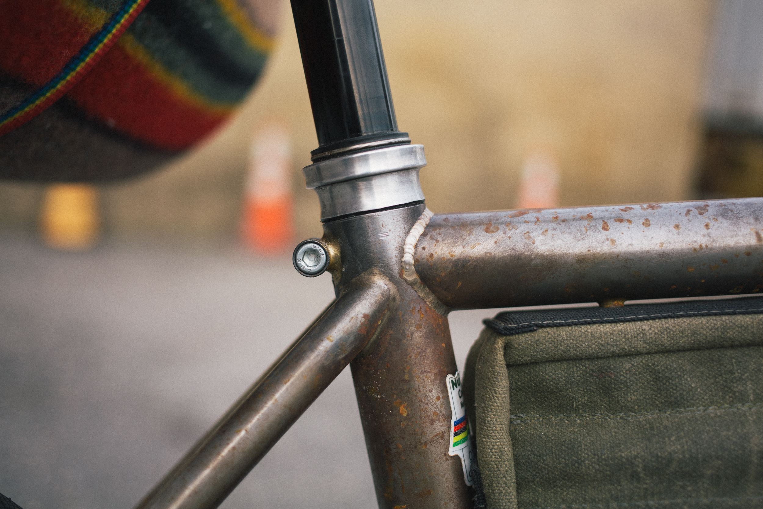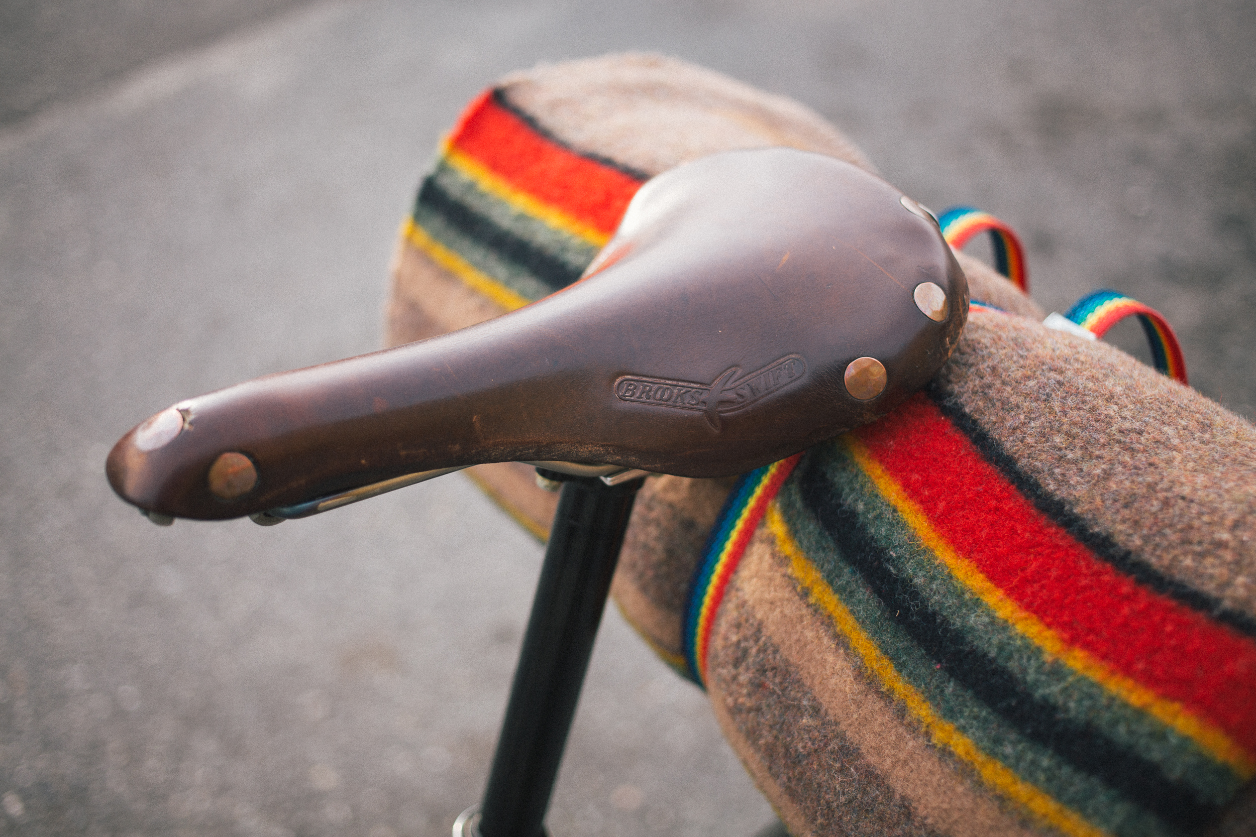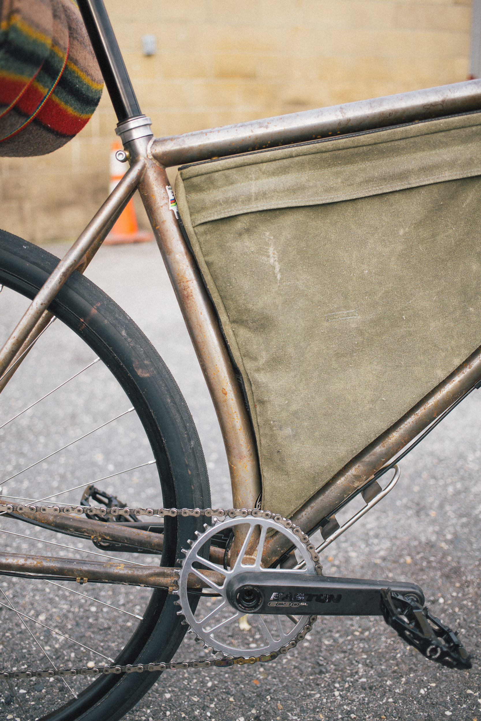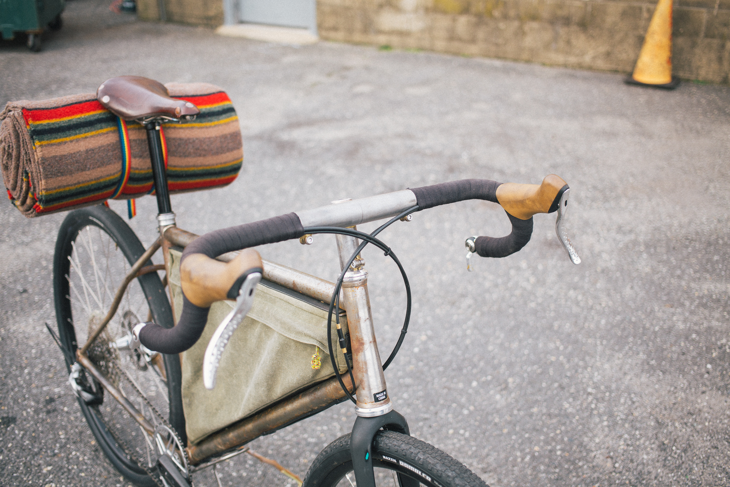 This is one of Kyle’s personal bikes, based on a frame he had made by Darren Larkin. I know Kyle had been thinking long and hard about what he wanted out of a personal bike, and this bike is pretty damn perfect, and has so many features that you probably wouldn’t even notice, it’s a true sleeper. A crusty tourer with the capability of ripping some trails and hitting a rhythm section. A true 700c ripper, or a 650b hardtail mountain bike! So many small details that could easily get skimmed over.