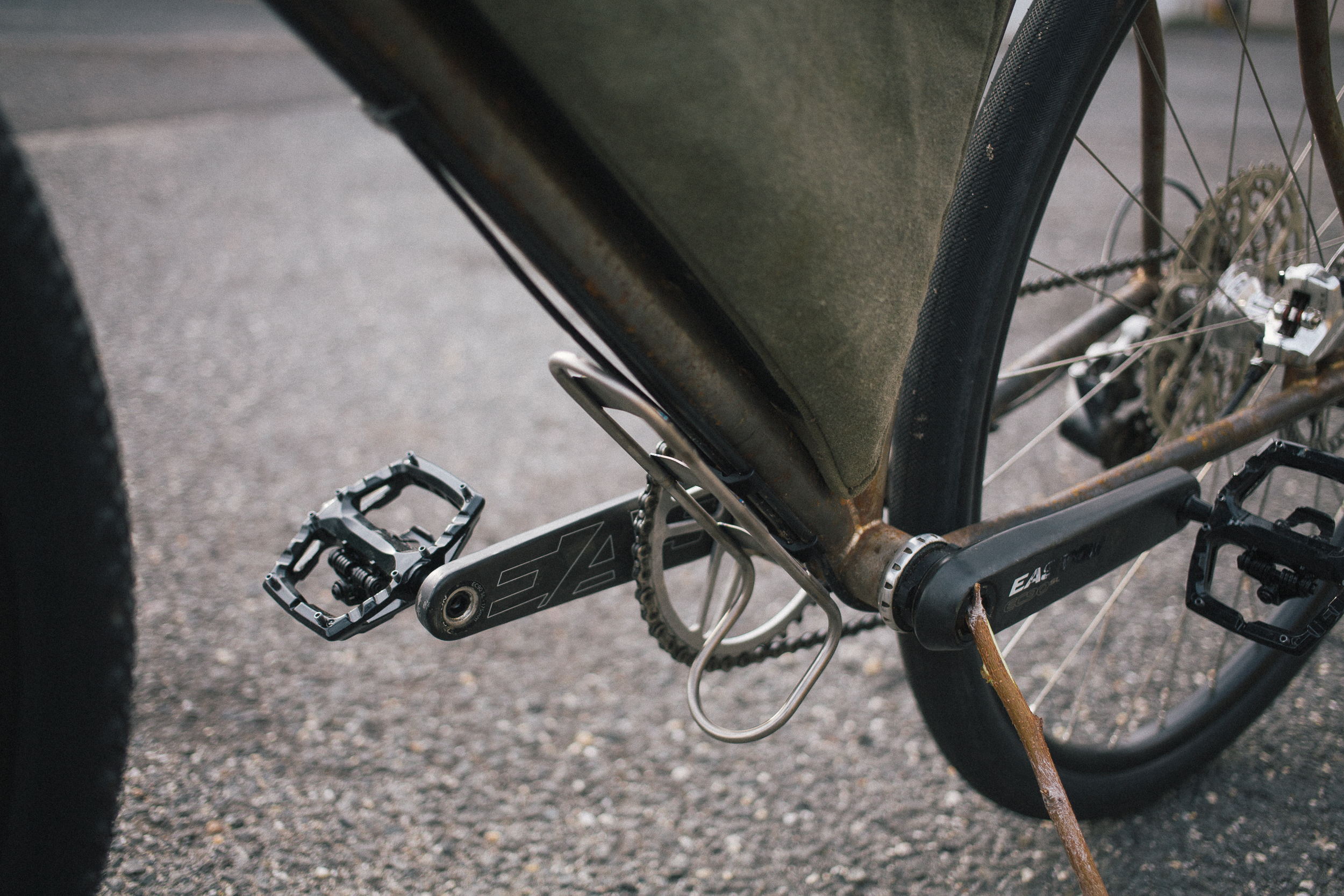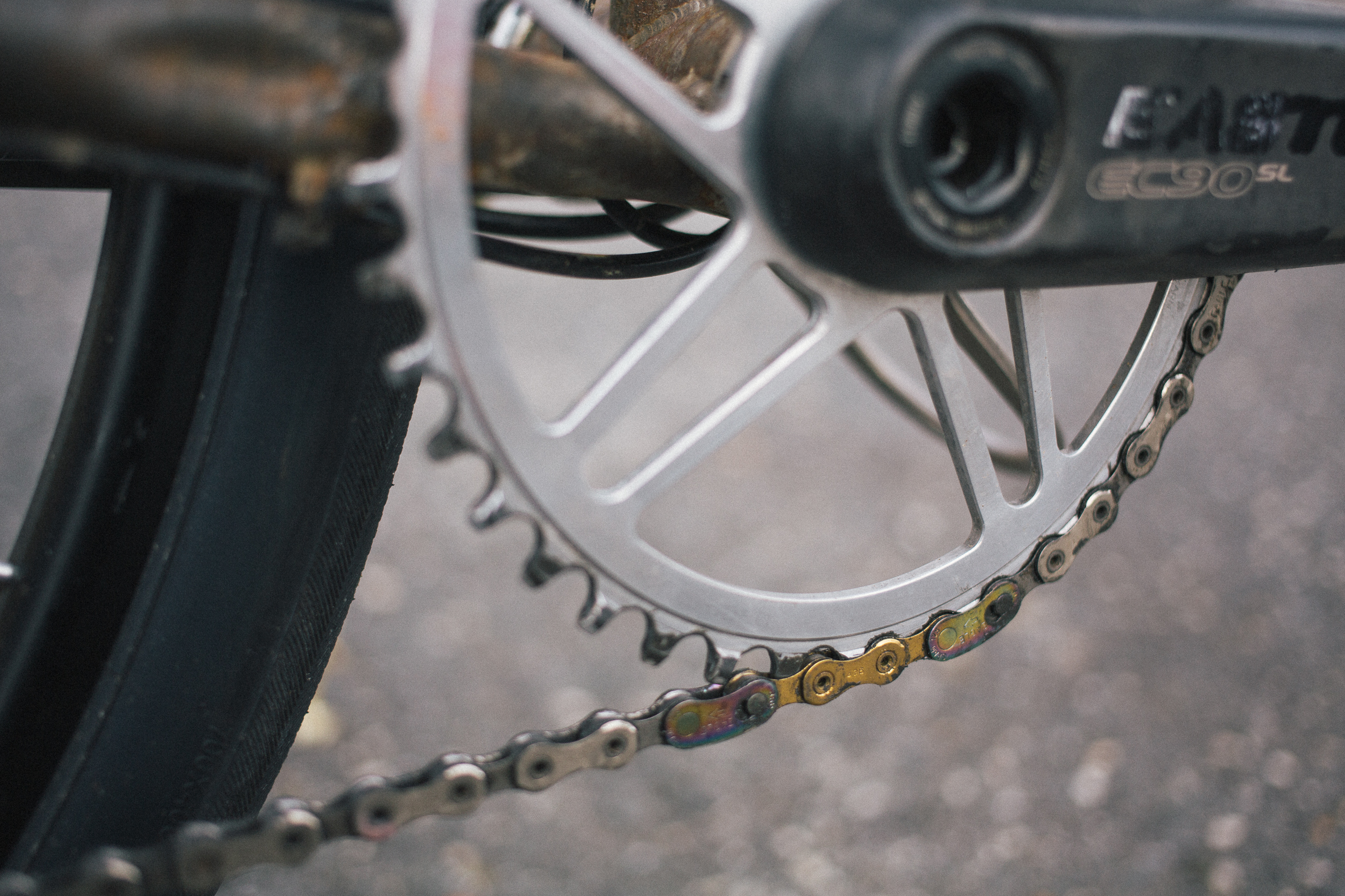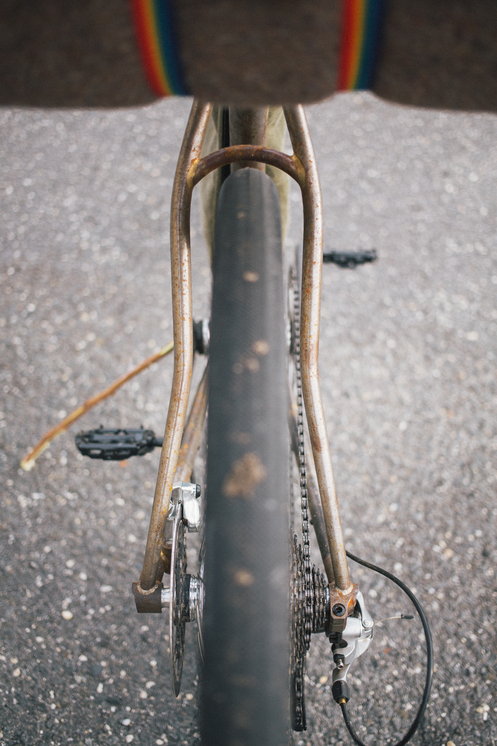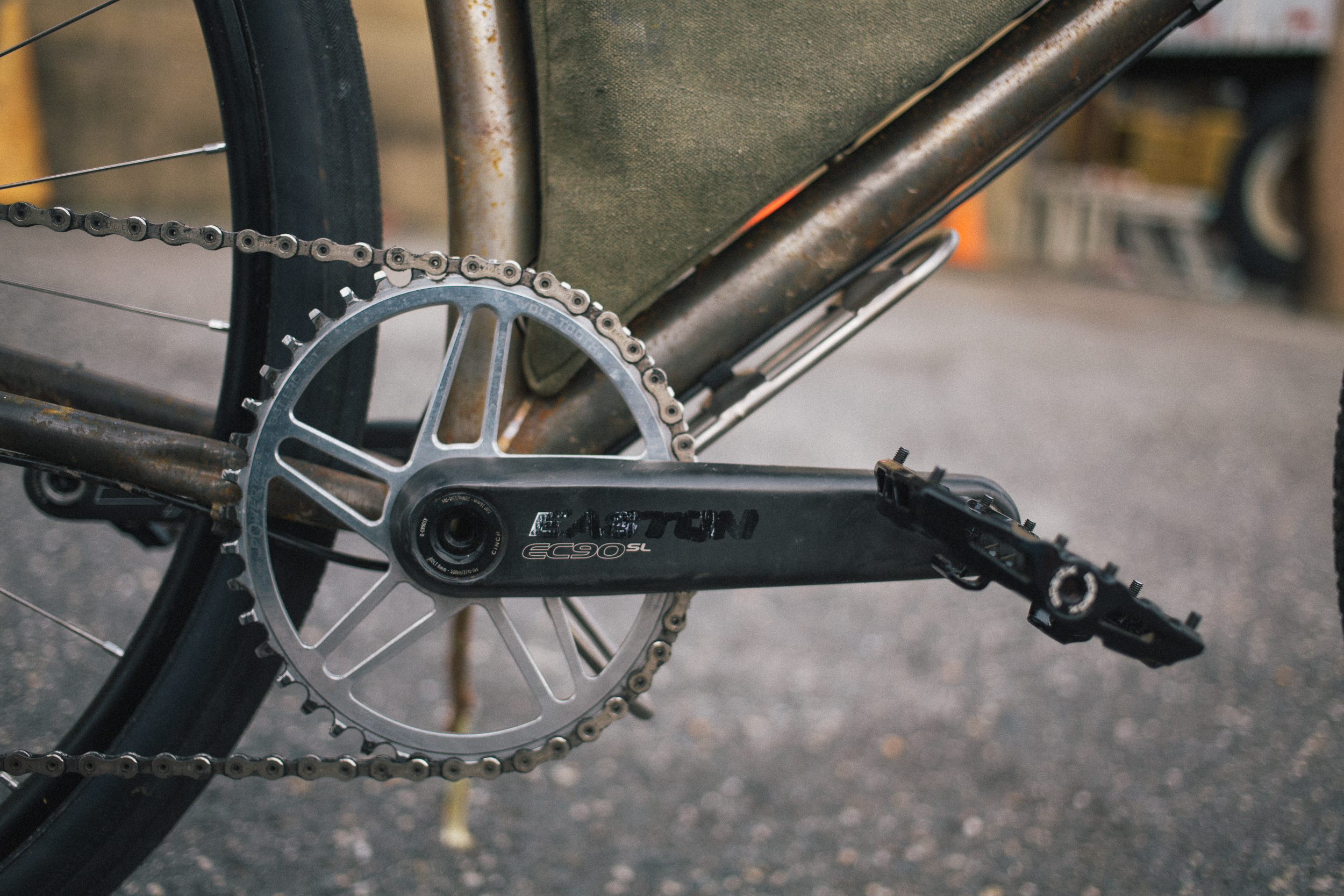 “I wanted to have super short rear end and lots of tire clearance so I had Darren use an 83mm English bb shell in the frame which is an old downhill standard that’s about to be re hashed in the name of the new standard dubbed “super boost”. I used race face’s extra long downhill spindle and their Easton road arms and retained a q-factor that’s still less than a typical MTB crank. This put the 44t road chainring in line for the boost rear end. By blending these standards and going wider at the bb I was able to achieve a 400mm rear end length with tons of room to spare. I wish I had spec’d a 375mm rear end because the room is there . For reference, The most common rear end length for a dj bike is around 485mm. The cassette is also kind of special, it’s made in Poland by Garbaruk, it’s a 10-48 11 speed that is all silver and light as fuck.”