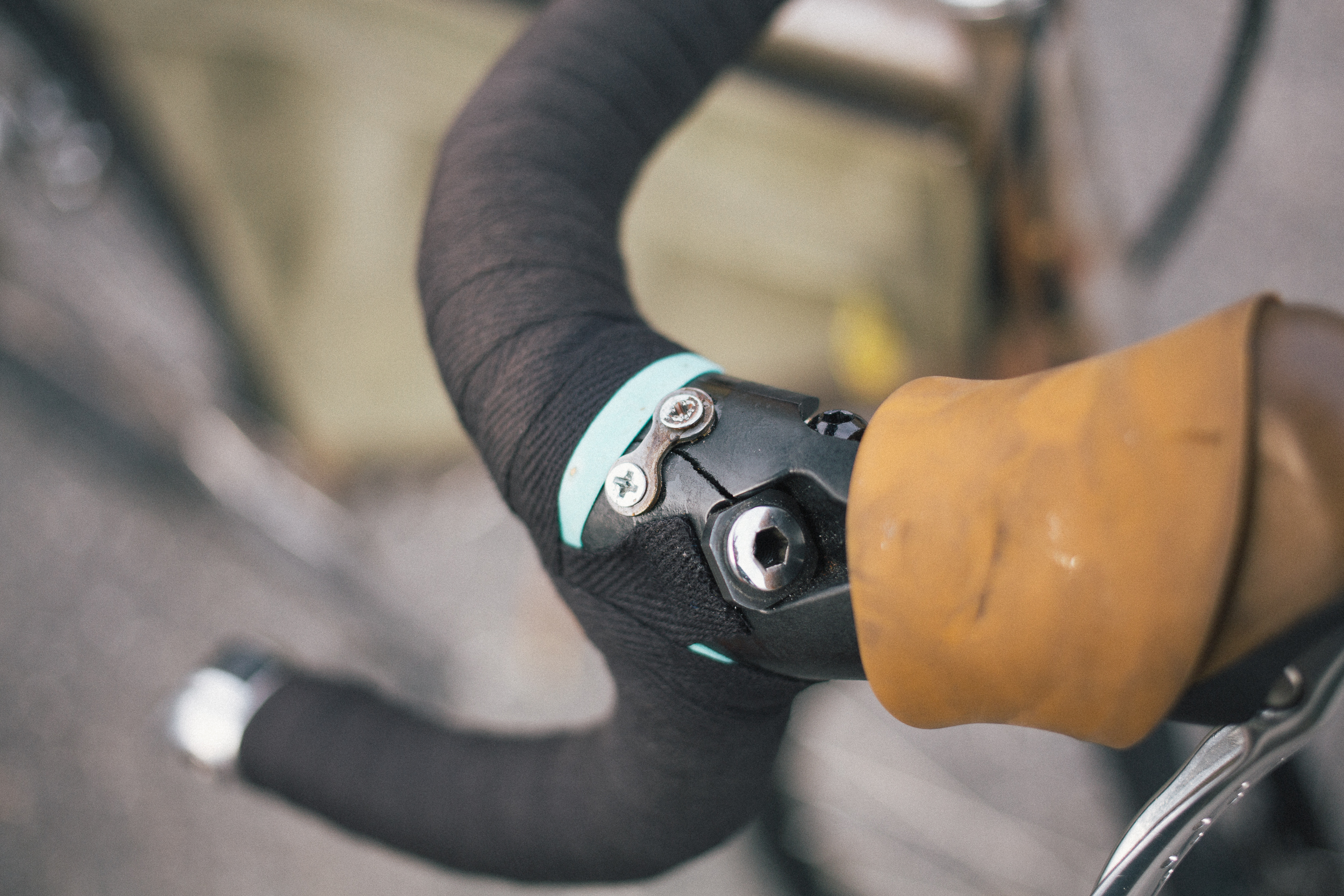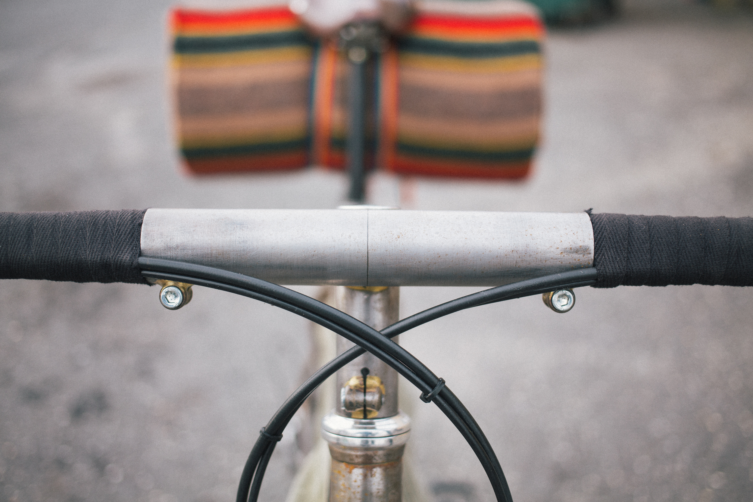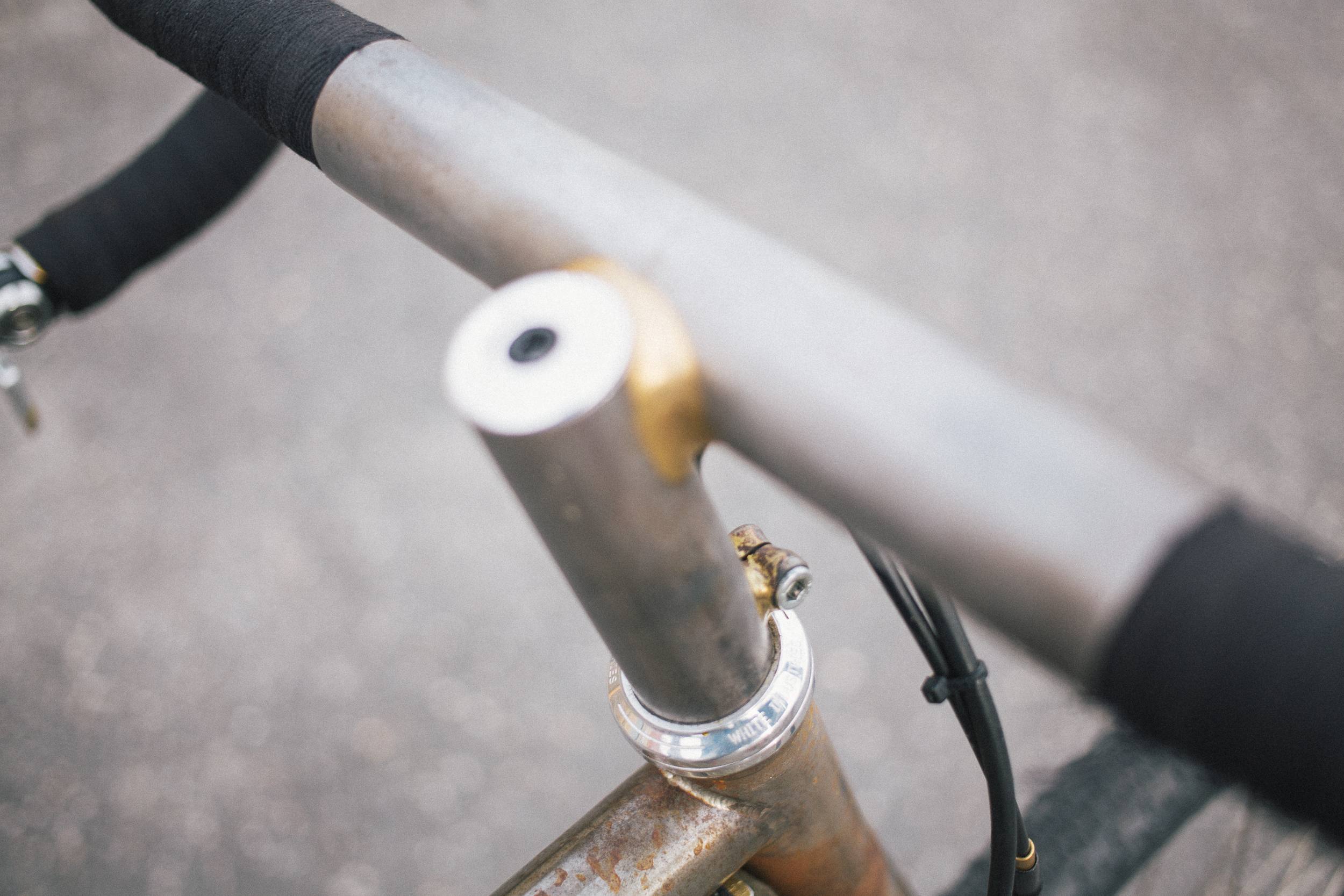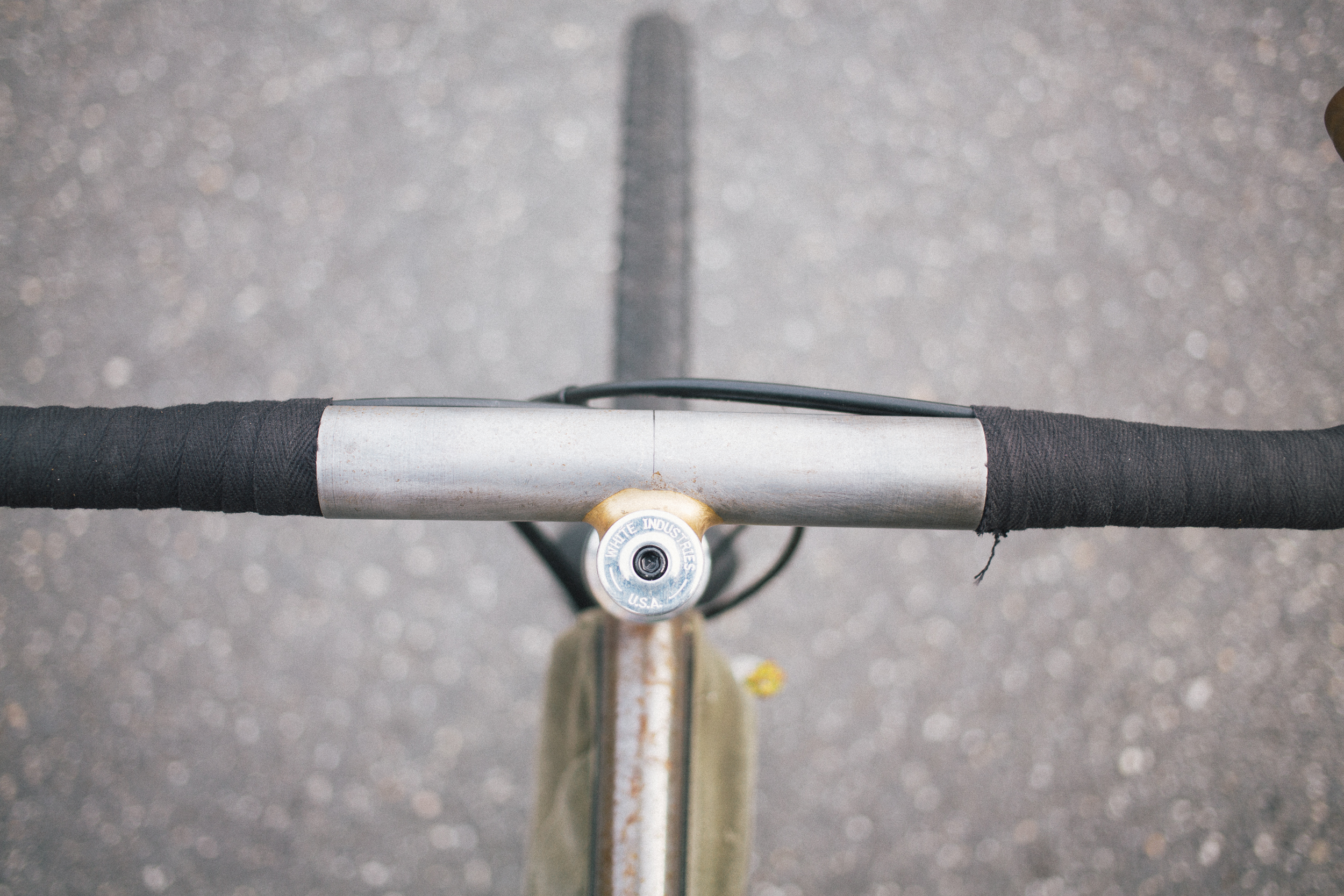 Kyle and I had a conversation about how much we love the Salsa Cowbell bars and the Cowchipper’s. Essentually love a good shallow road drop with some healthy flare. One of our qualms with the flared drop bar though, is that the width at the drops on bars like the Cowbell, is perfect, but the width at the hoods sometimes feels too narrow. Kyle took this as a challenge and cut a pair of Cowbell bars in half, and made his own stem in-house to fit them so he could change the overall width easily and on demand.