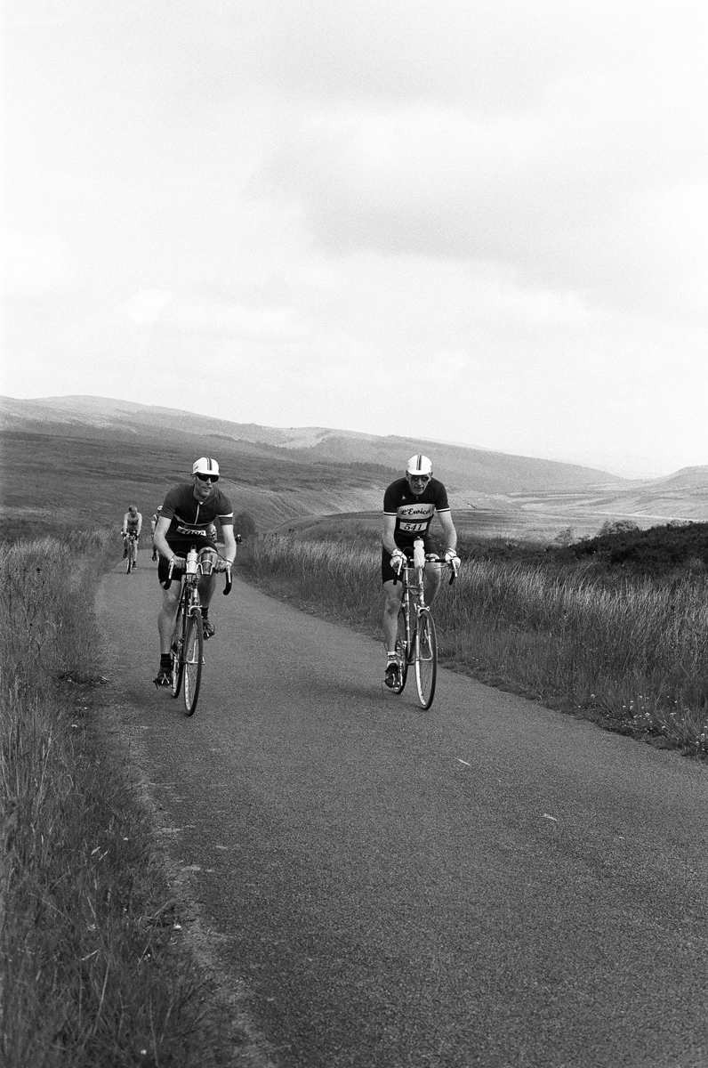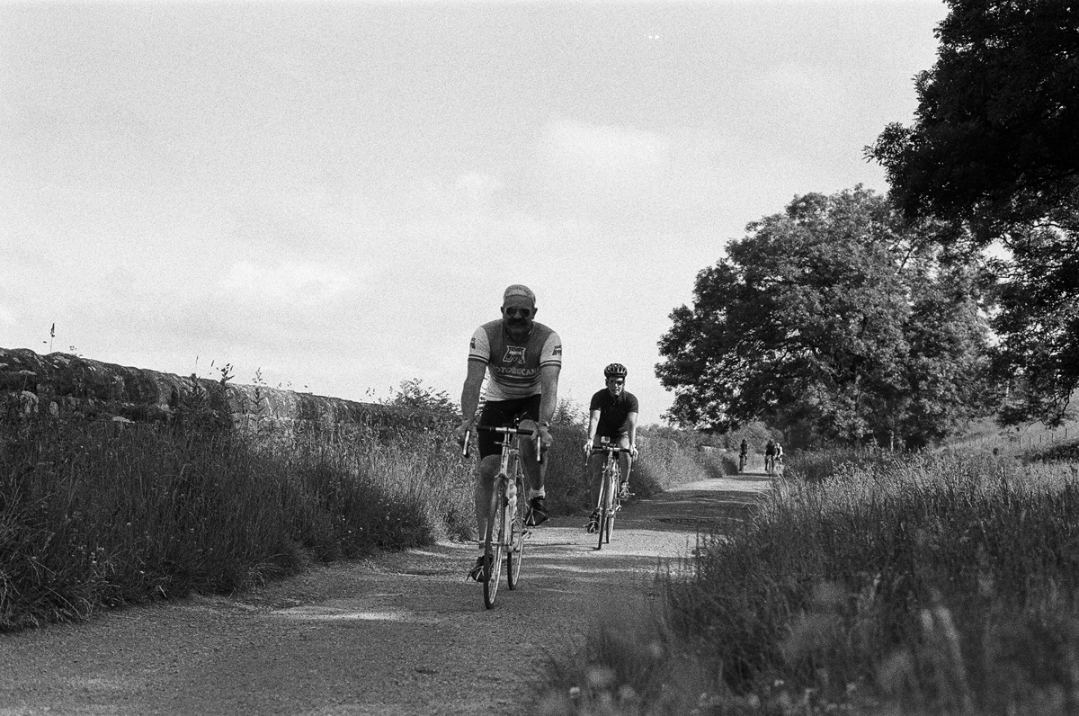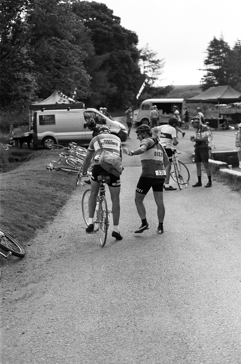 As a European contributing to an American website, I’m always concious that what I upload may lose or gain appeal as it crosses the Atlantic. Track bike crits around London and road racing are generally fairly safe territory, but grown ups in fancy dress on old bikes is a bit of a grey area. No doubt though, it was a great event. Only pre 1987 bikes and kit were allowed on a hilly 100 mile route through the Peak District in the north of England. I went and joined them for a bit (on a not very old carbon Cinelli) and shot some black and white film. At a rest stop I had a chat with competitors from all over the world. Some were riding as teams speaking several different languages, who’d met at the festival site in Bakewell. Others had come from Japan, The USA, New Zealand and all over Europe. Over coffee from a Rapha H-Van they all told me how tough it was and how much fun it was. I have a wobbly old 70’s Vitus, and next year, I’m totally getting a woollen jersey and some short shorts so I can get involved.