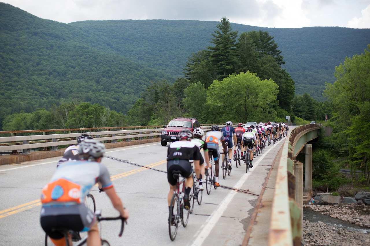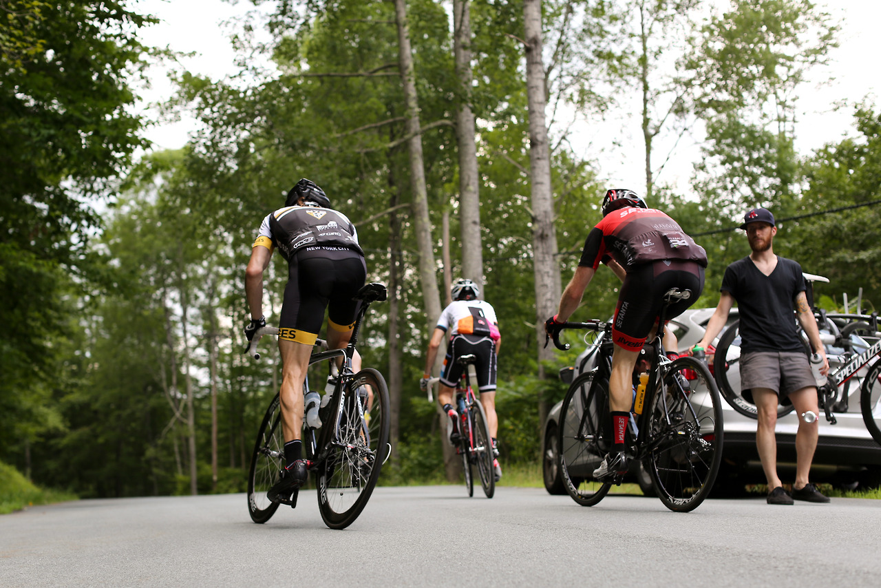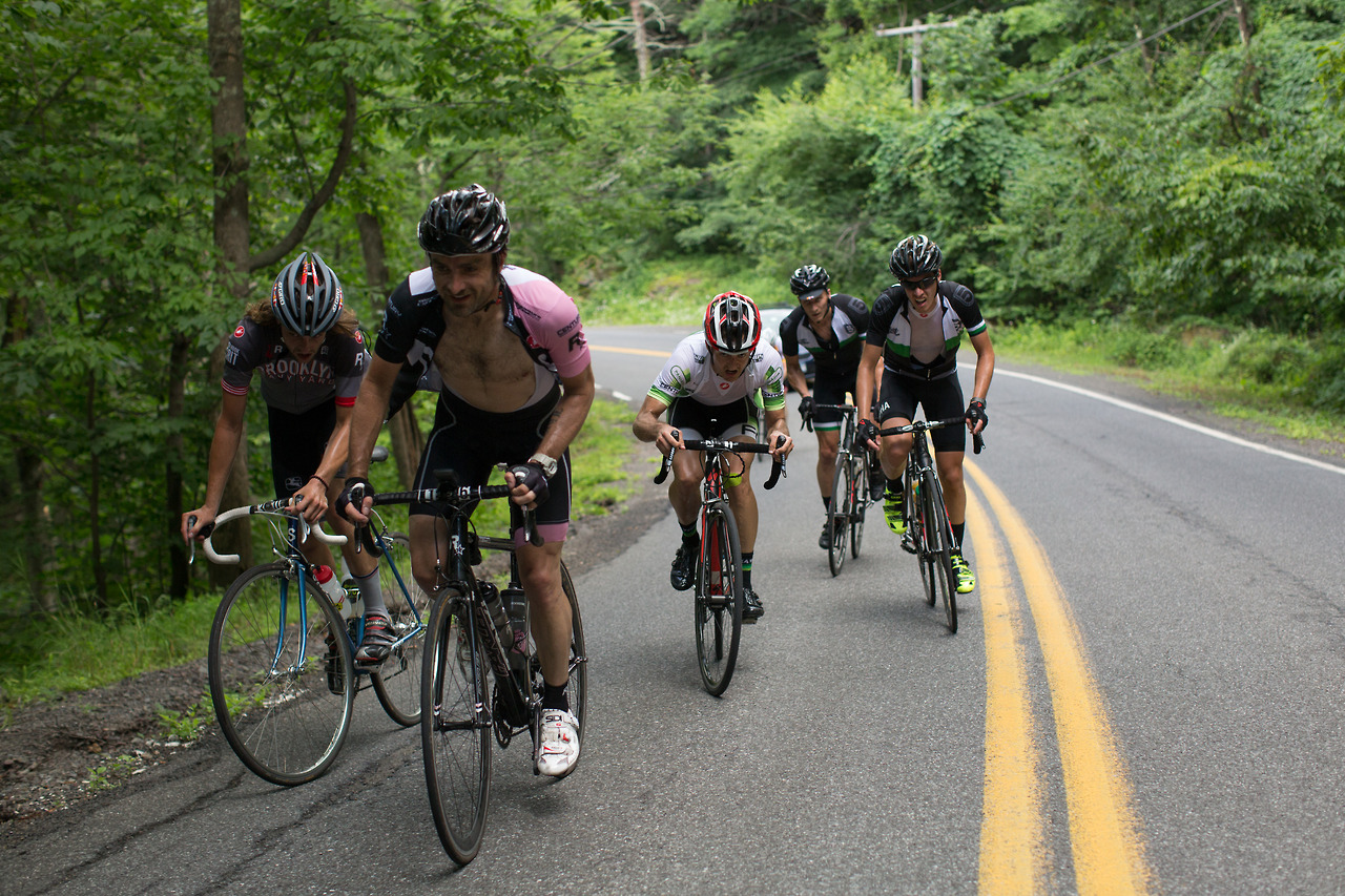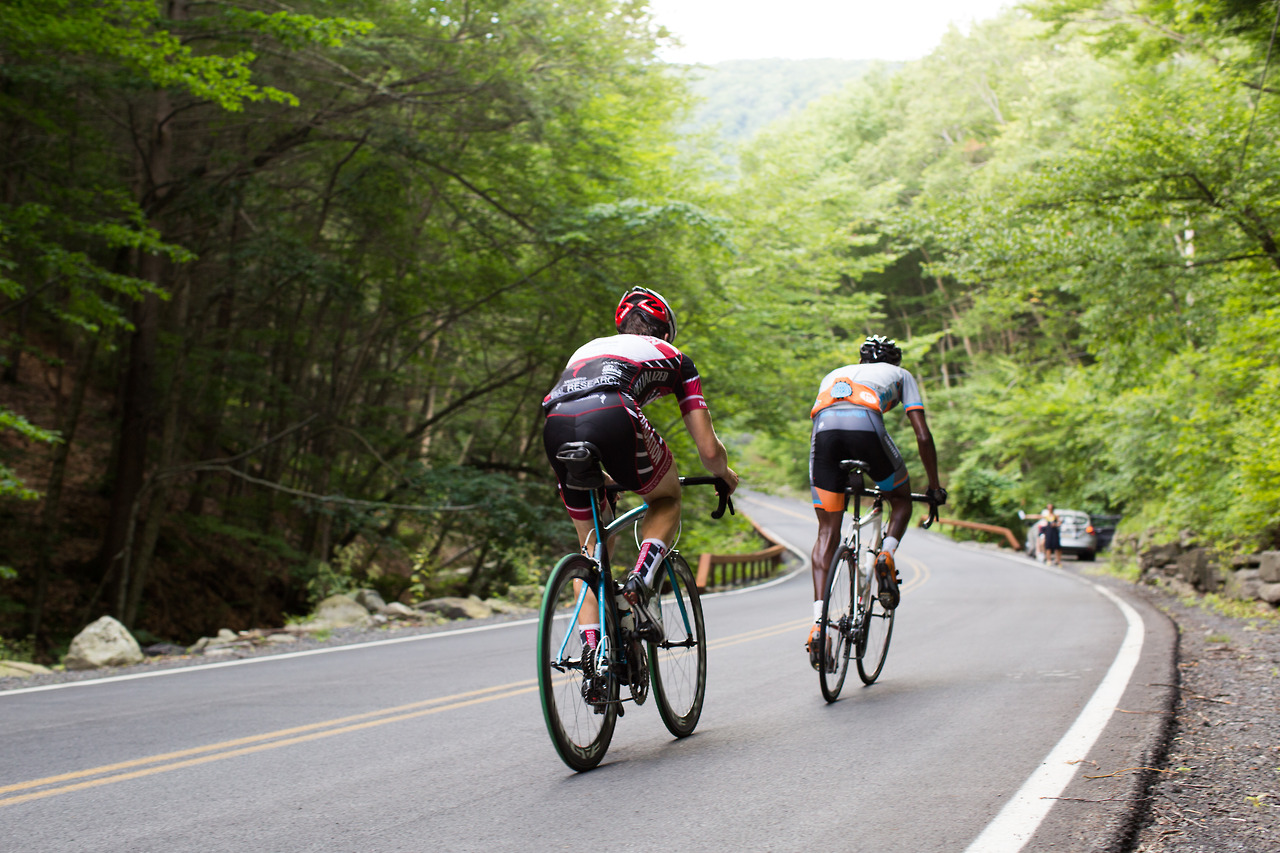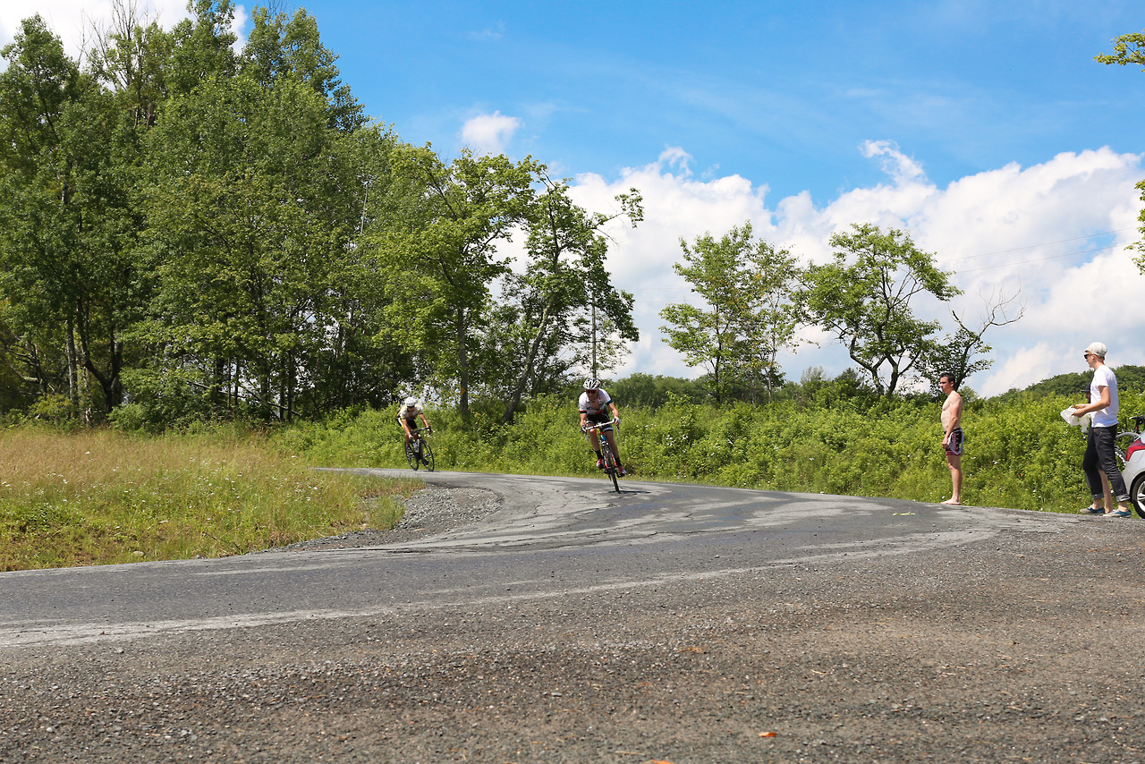 “Neil Bezdek in his first Neversink Invitational attacked at mile 0 and disappeared from the peloton. He powered away to a three minute lead and wasn’t caught until mile 55. A few miles later in the 95 degree heat he cramped severely and dropped out. Watching a seasoned pro ride himself into the ground was a rare moment. The field stayed together until Peekamoose where it broke into different groups of varying abilities. The groups further shattered on Sugarloaf with alpine specialist Sean Smith setting the fastest ever ascent up the famed climb. Michael Boardman was initially gapped but recovered to make contact by the summit. The rest of the field was blown across an hour of roadway and no longer in contention. This edition featured a long flat section between Sugarloaf and the final climb on Hunter Rd. Smith and Boardman marked each until the 20% grades kicked in where it came down to a simple power-to-weight ratio contest. With the road pointing to the sky Boardman inched away from Smith to take the victory. Jayson Jacobs finished third with Jesse Walker and Evan Murphy finishing the top five.”