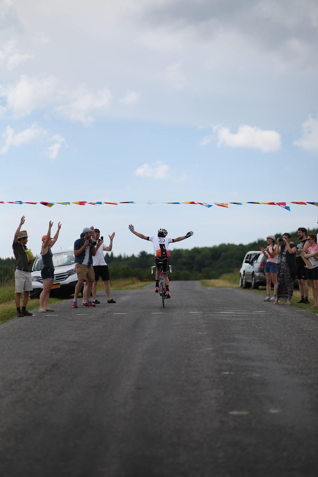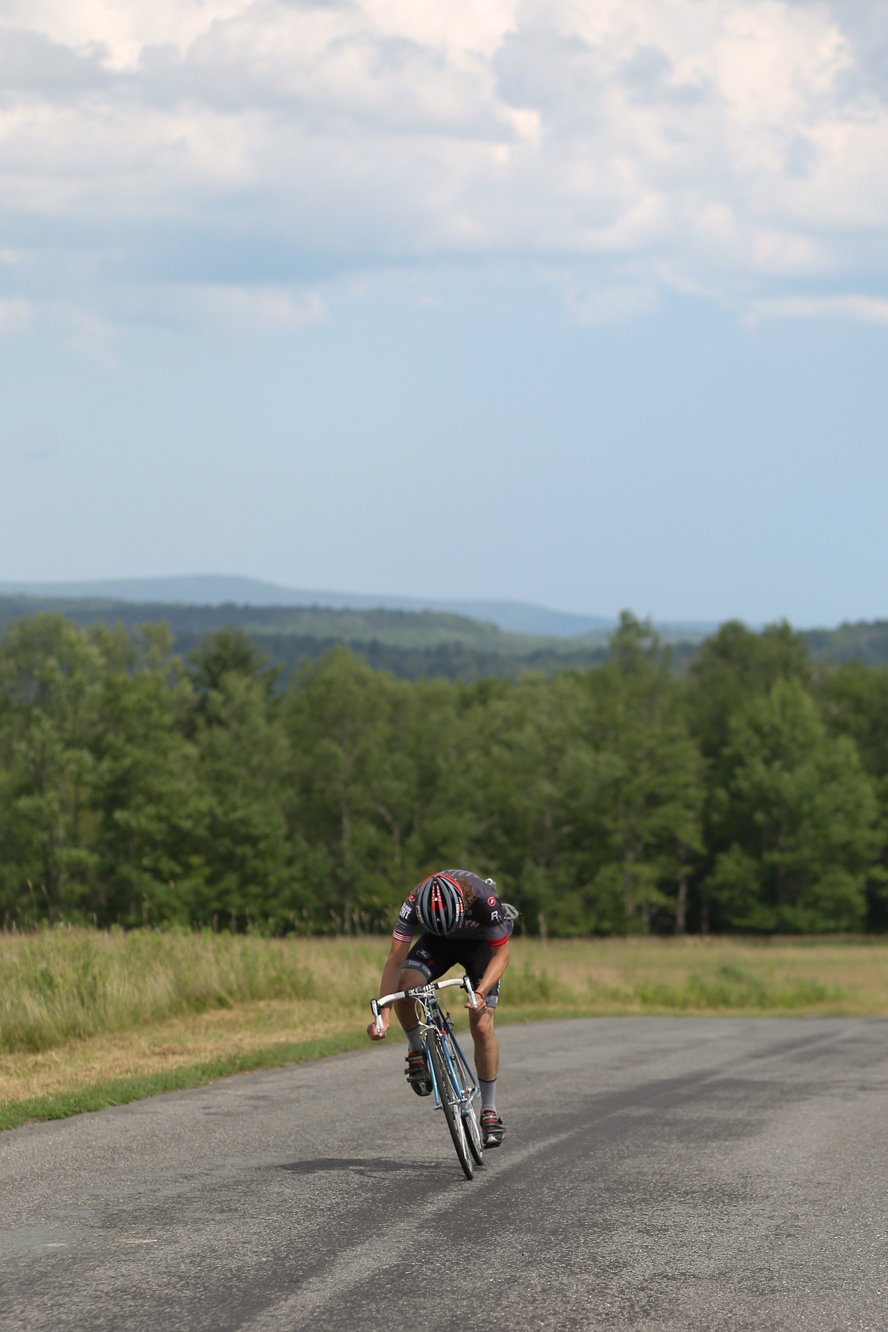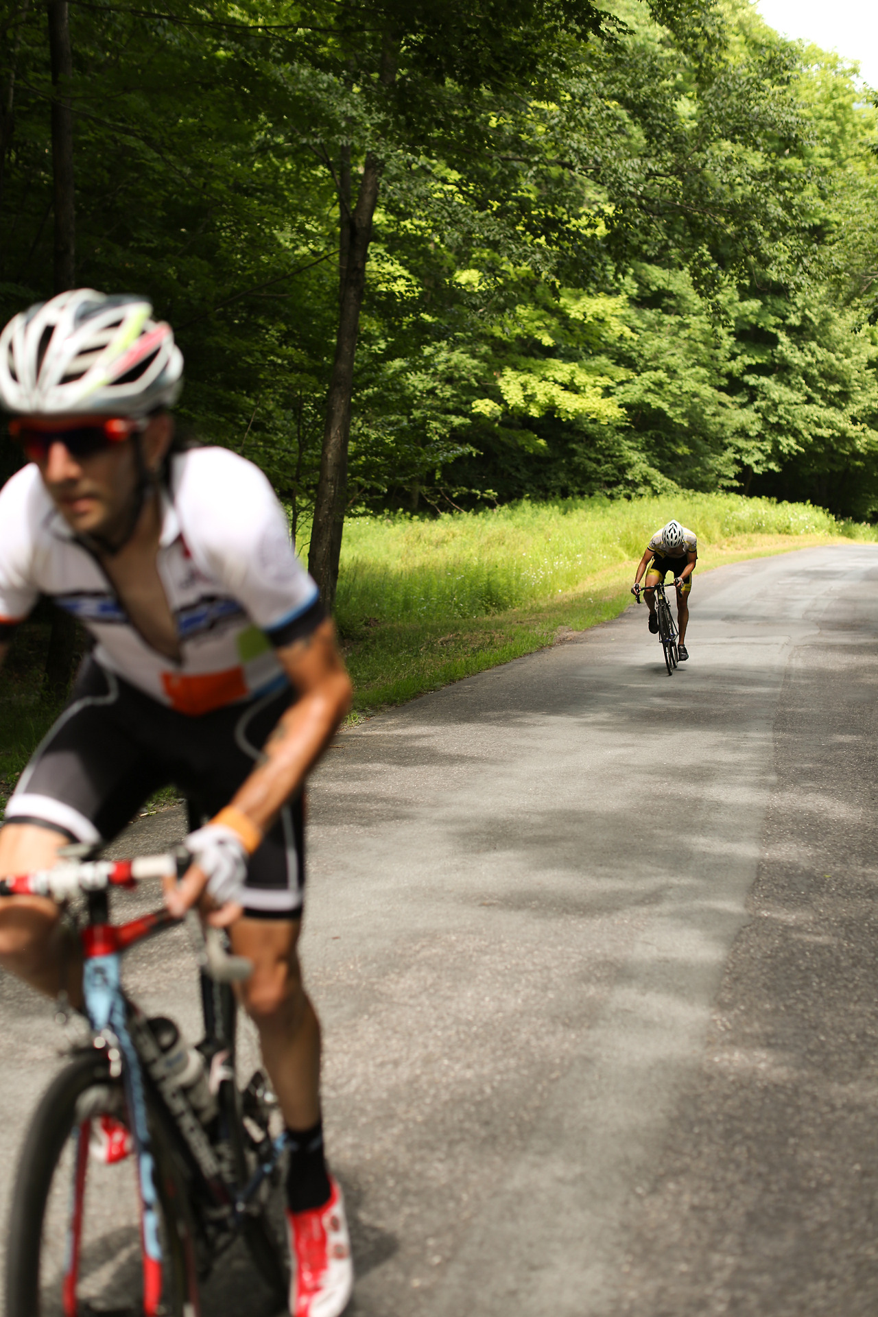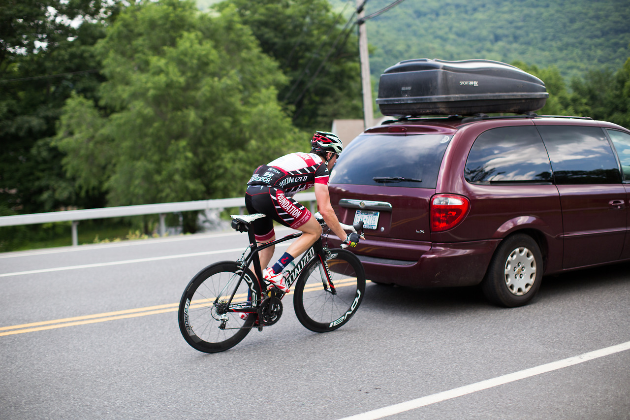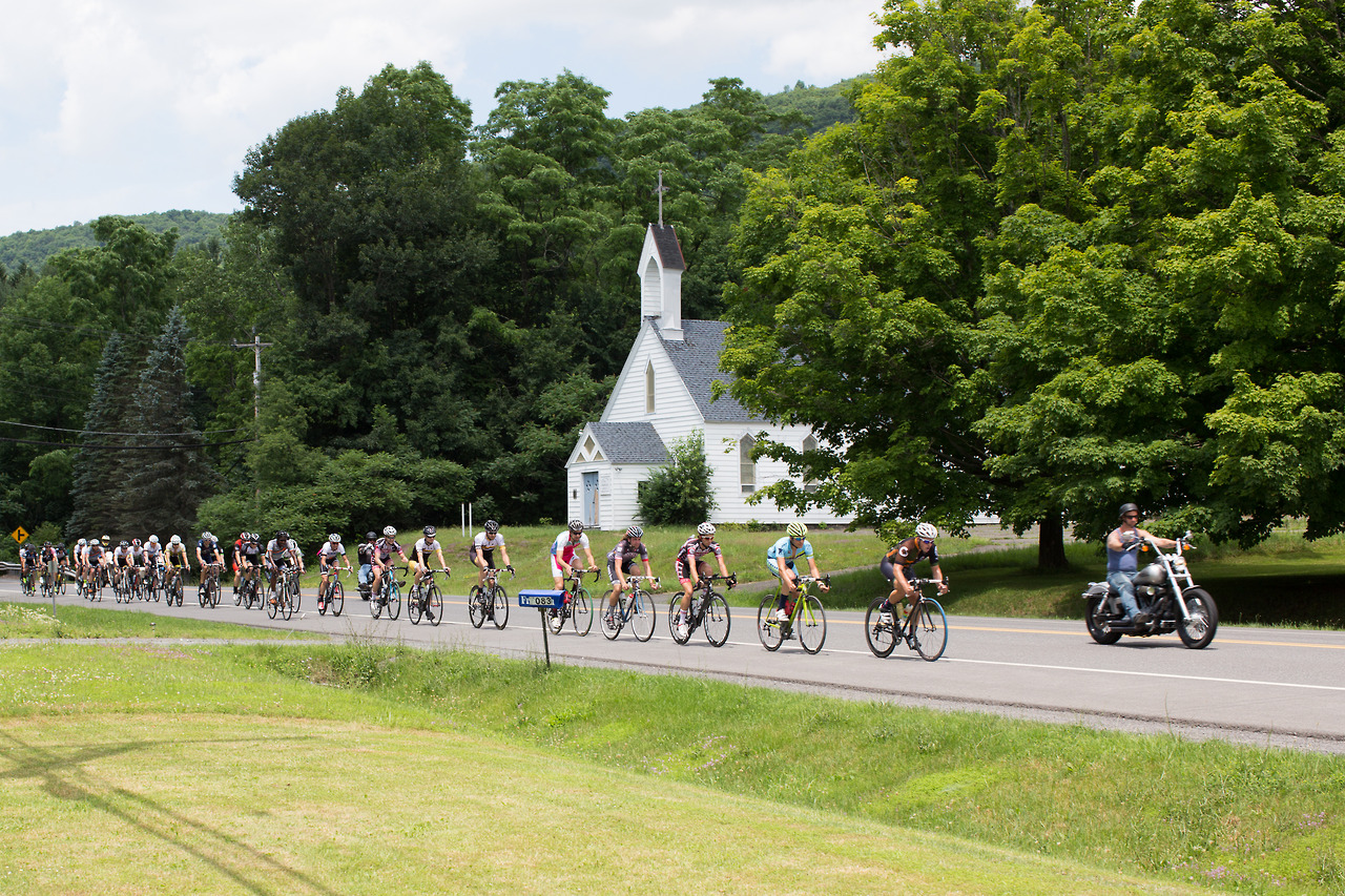 “Neil Bezdek in his first Neversink Invitational attacked at mile 0 and disappeared from the peloton. He powered away to a three minute lead and wasn’t caught until mile 55. A few miles later in the 95 degree heat he cramped severely and dropped out. Watching a seasoned pro ride himself into the ground was a rare moment. The field stayed together until Peekamoose where it broke into different groups of varying abilities. The groups further shattered on Sugarloaf with alpine specialist Sean Smith setting the fastest ever ascent up the famed climb. Michael Boardman was initially gapped but recovered to make contact by the summit. The rest of the field was blown across an hour of roadway and no longer in contention. This edition featured a long flat section between Sugarloaf and the final climb on Hunter Rd. Smith and Boardman marked each until the 20% grades kicked in where it came down to a simple power-to-weight ratio contest. With the road pointing to the sky Boardman inched away from Smith to take the victory. Jayson Jacobs finished third with Jesse Walker and Evan Murphy finishing the top five.”
