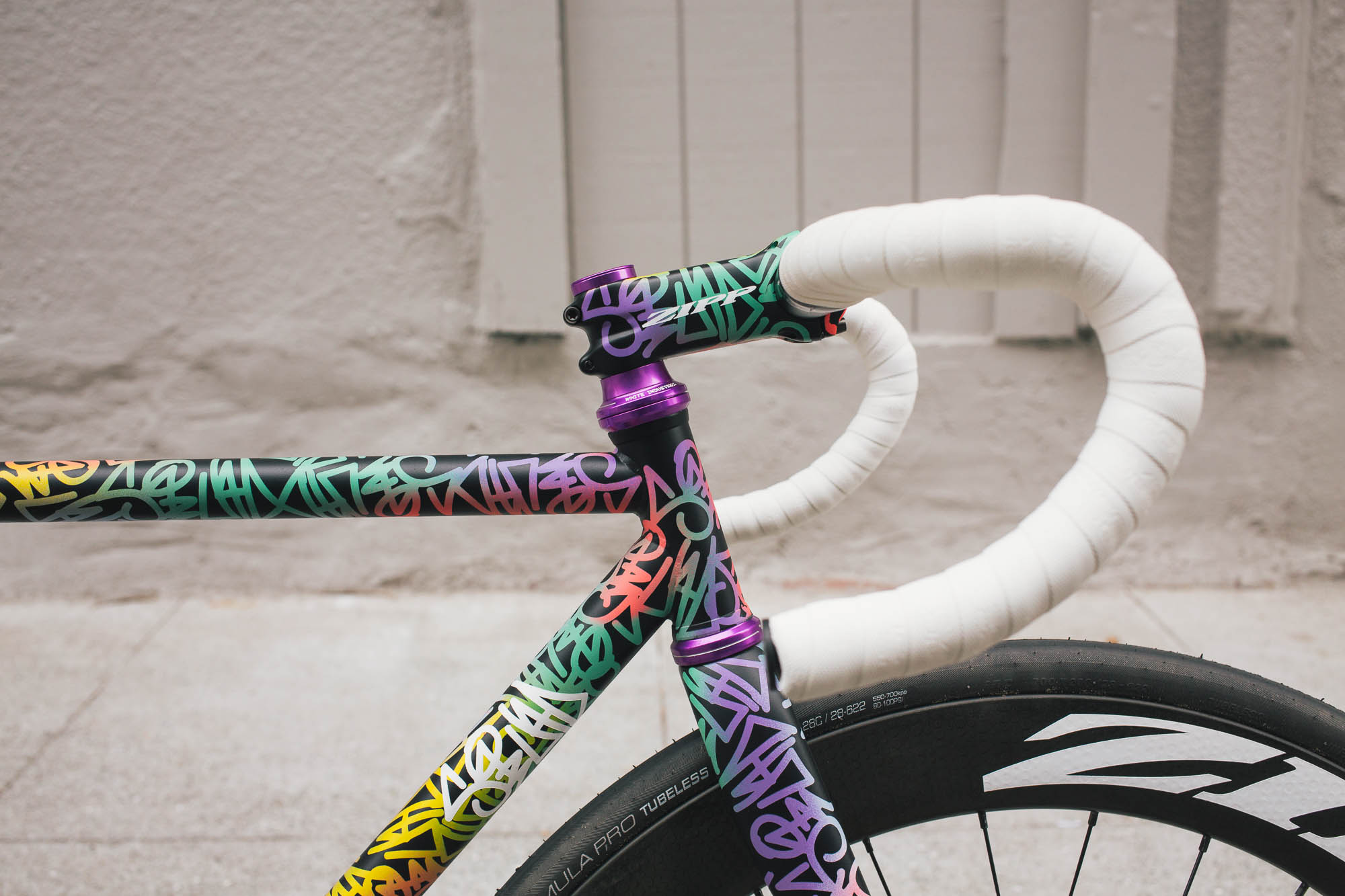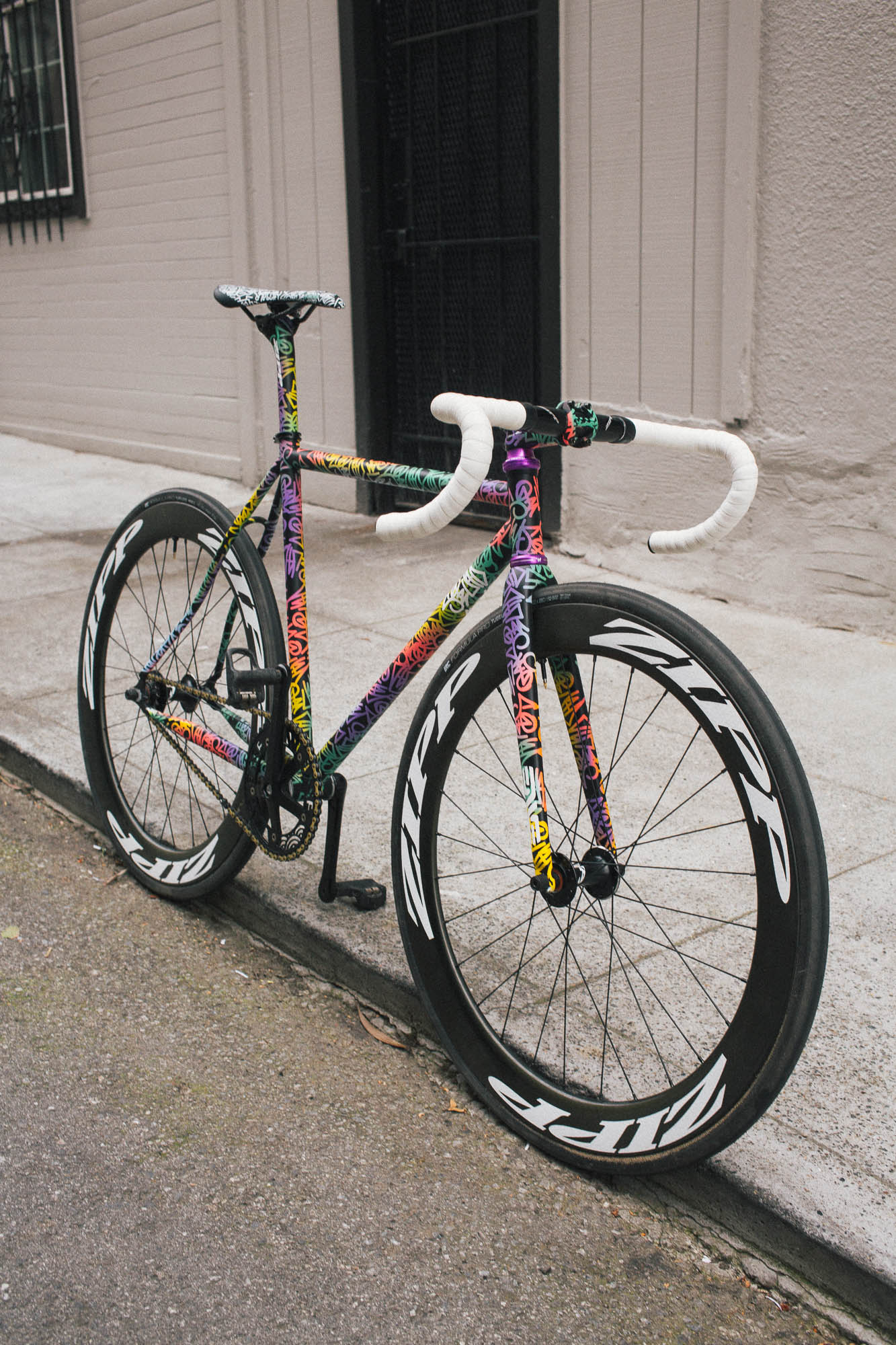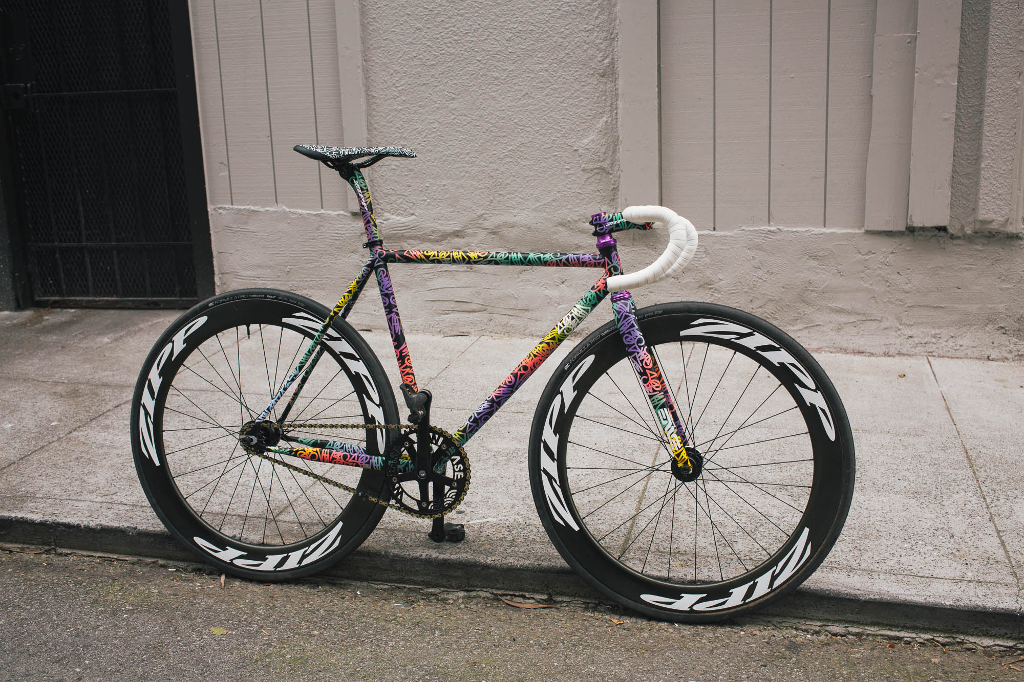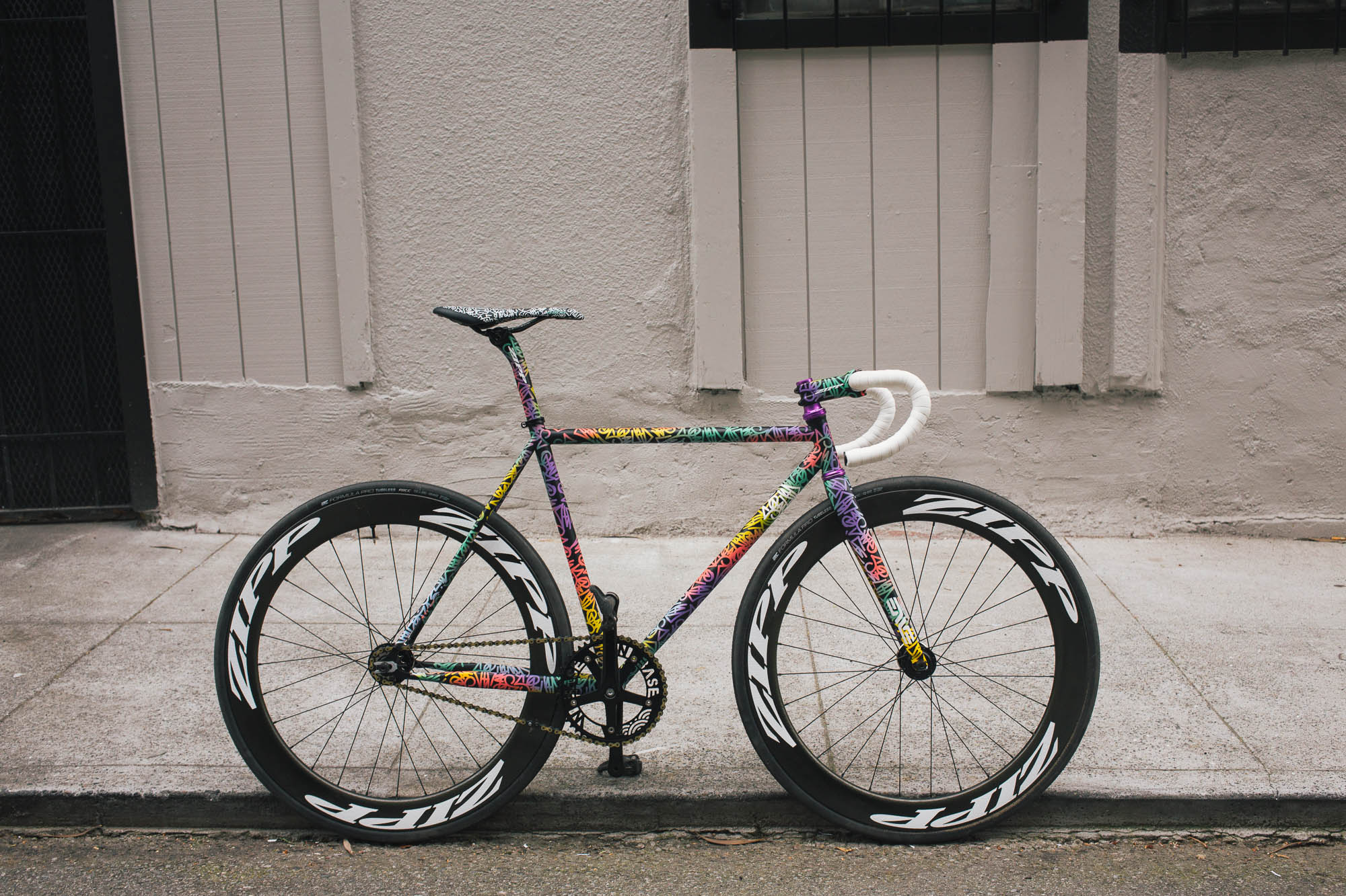 This track build IS SO SICK!!! It’s the perfect example of Squid’s style, paired with Sammi’s love for color, all while showcasing the power and versatility of the spray bike brand paint in the signature squid style. Throw on a W-base chainring, and some deep Zipp’s, and damn, this thing is so sick.