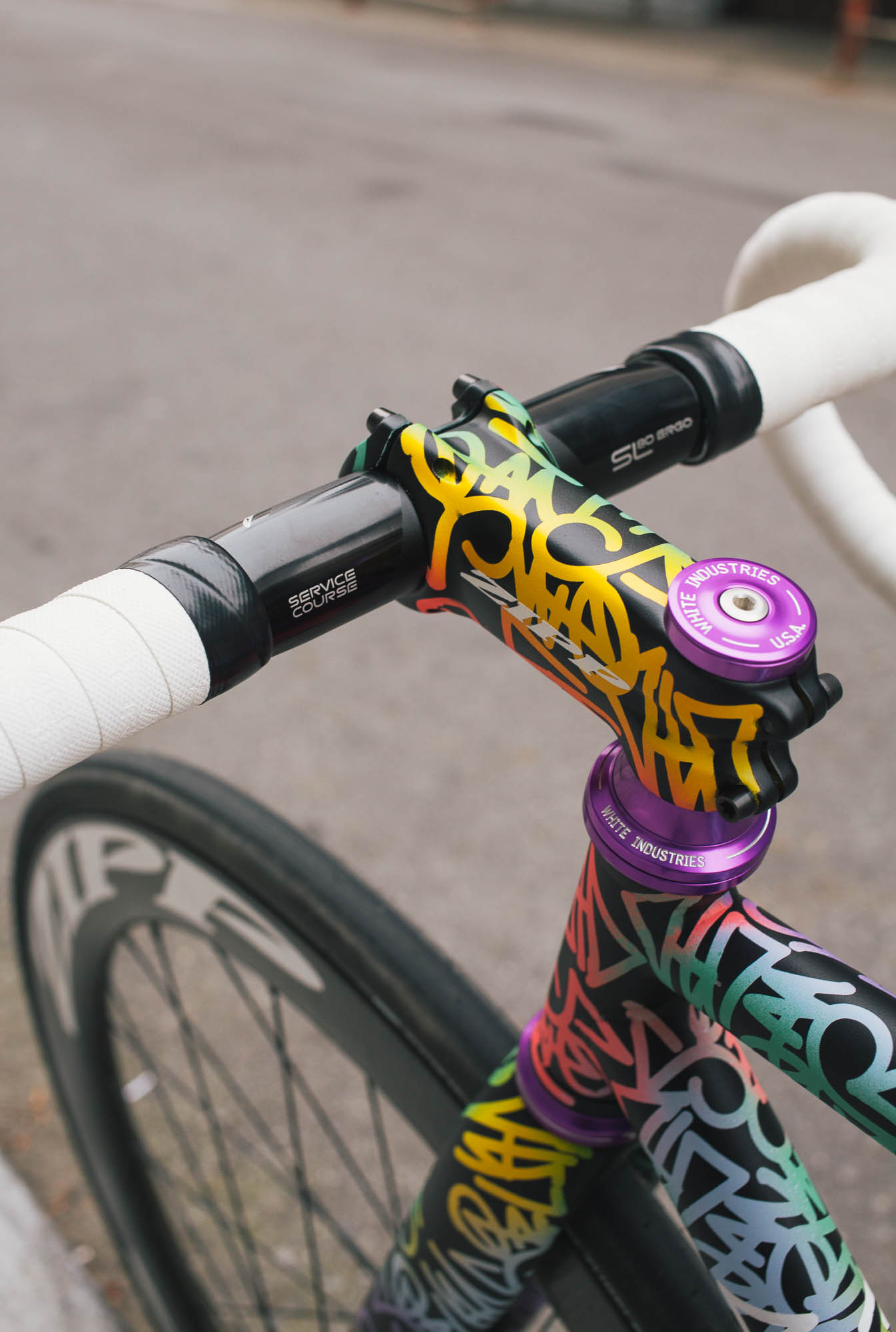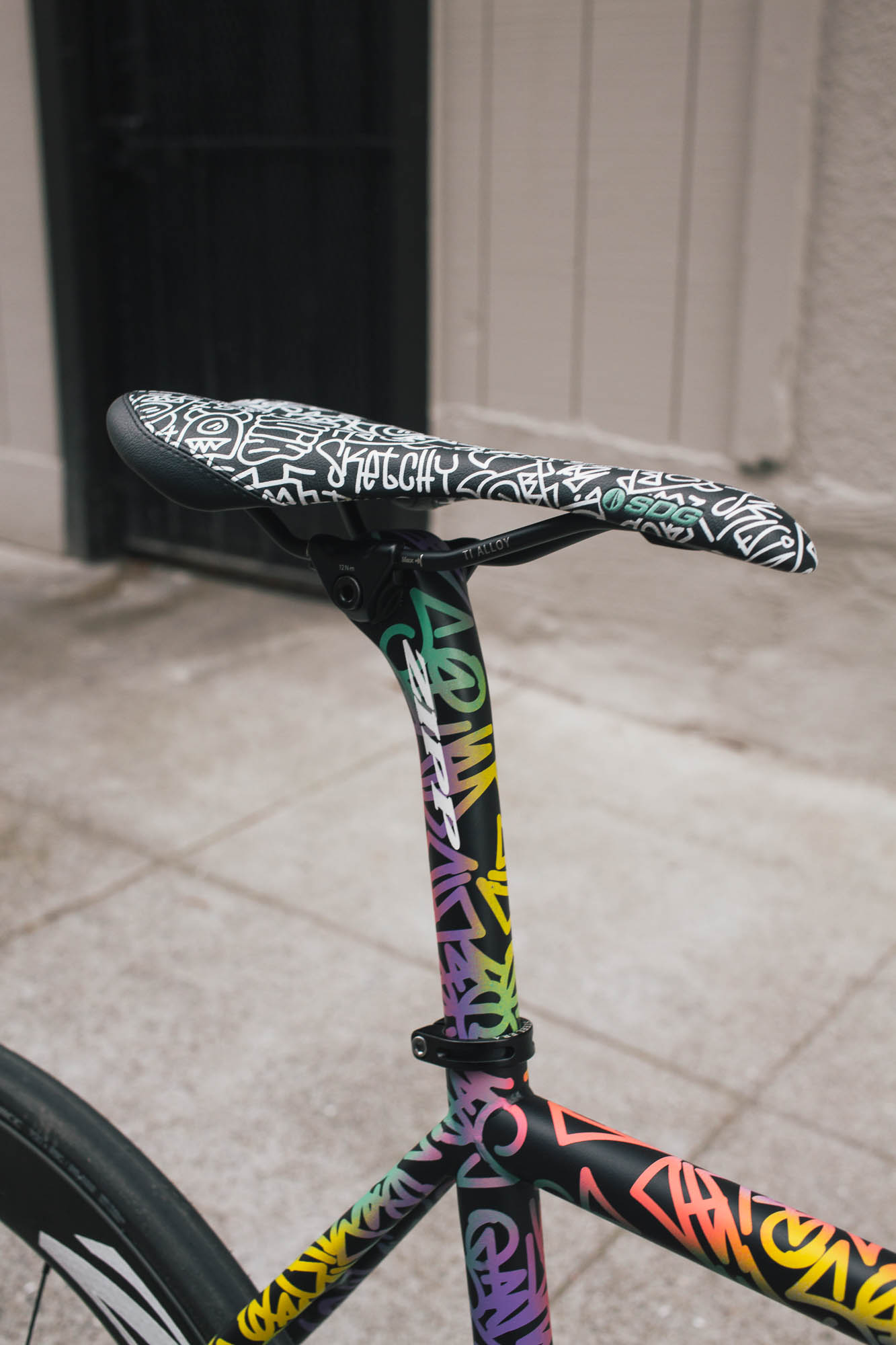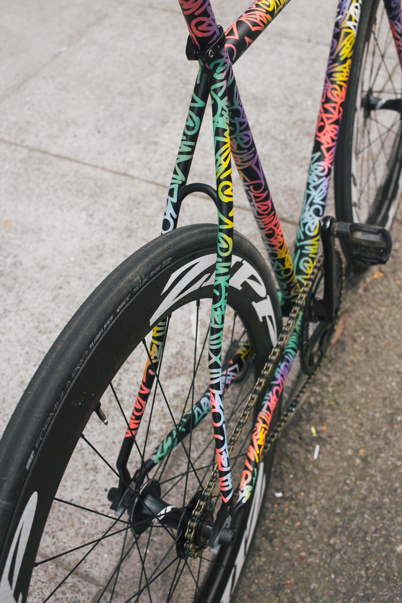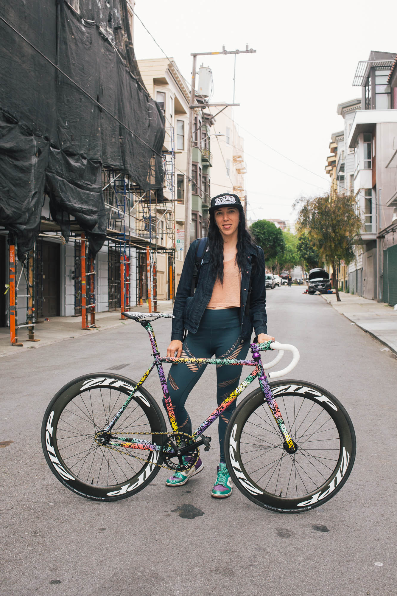This track build IS SO SICK!!! It’s the perfect example of Squid’s style, paired with Sammi’s love for color, all while showcasing the power and versatility of the spray bike brand paint in the signature squid style. Throw on a W-base chainring, and some deep Zipp’s, and damn, this thing is so sick.