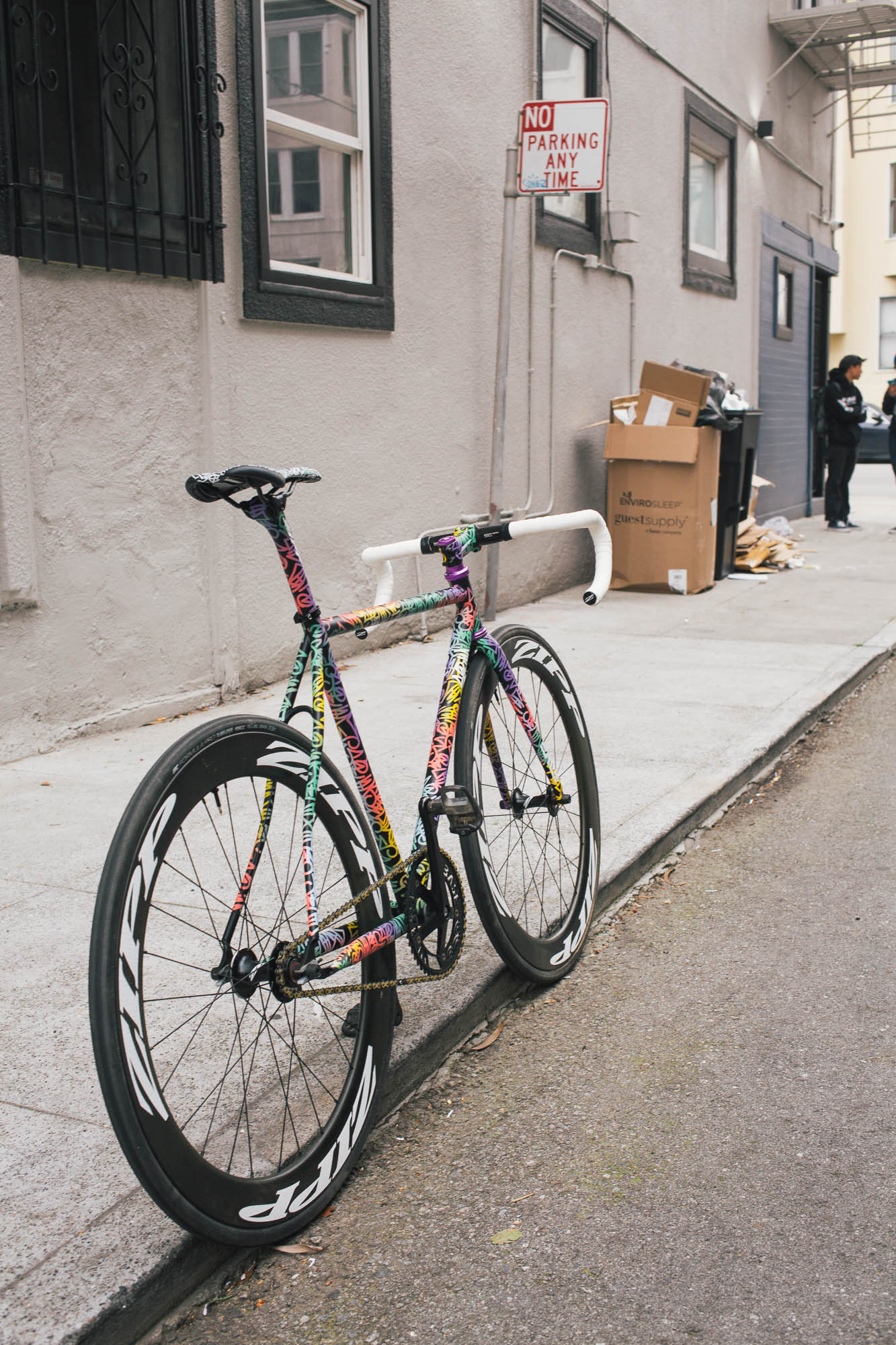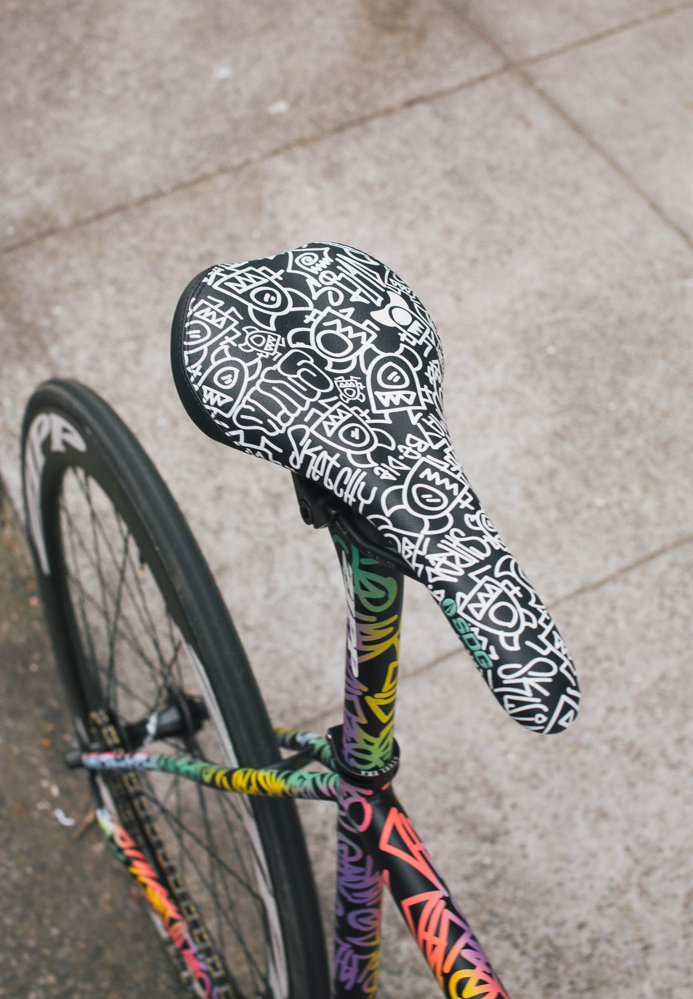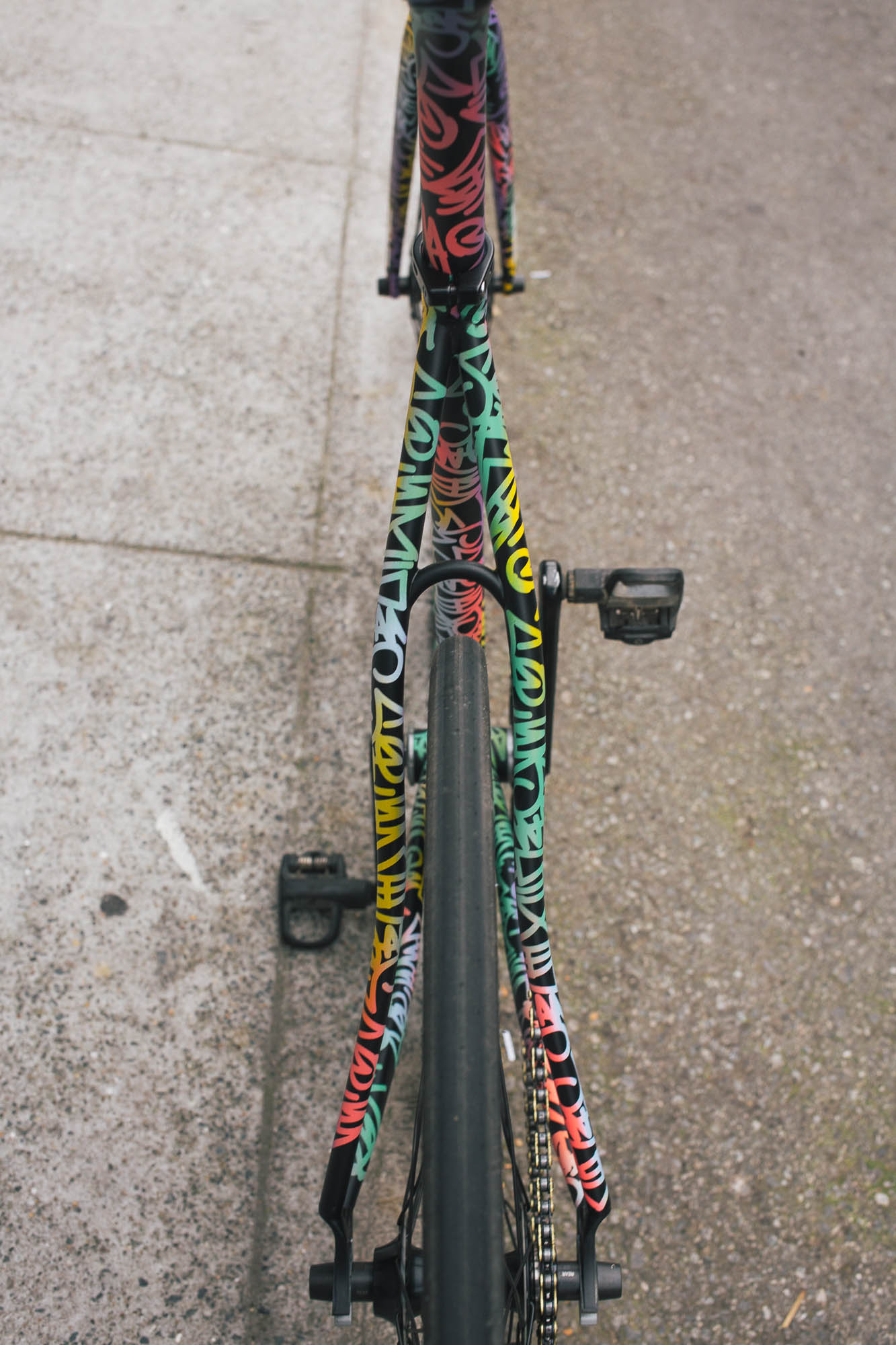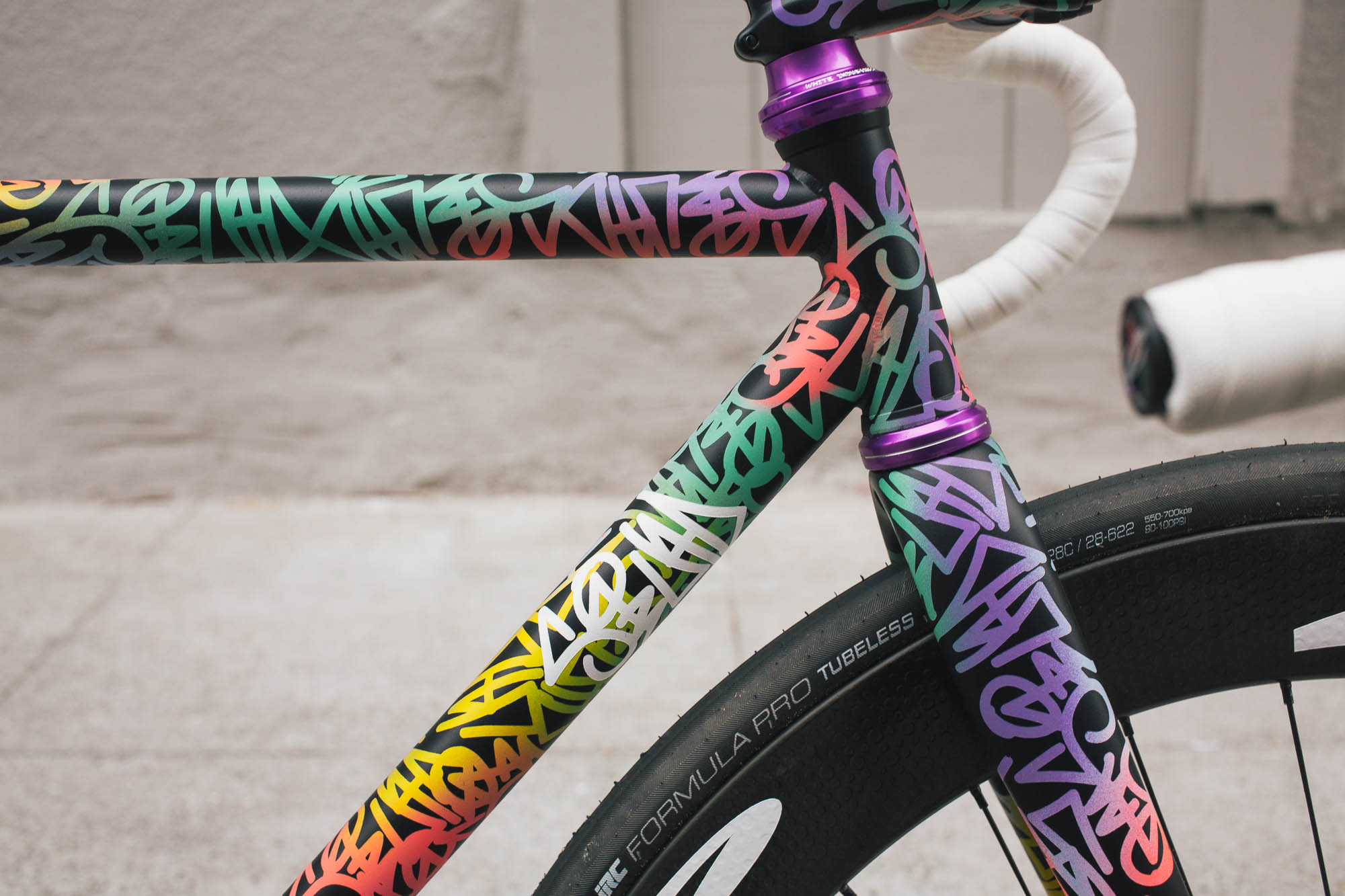 This track build IS SO SICK!!! It’s the perfect example of Squid’s style, paired with Sammi’s love for color, all while showcasing the power and versatility of the spray bike brand paint in the signature squid style. Throw on a W-base chainring, and some deep Zipp’s, and damn, this thing is so sick.