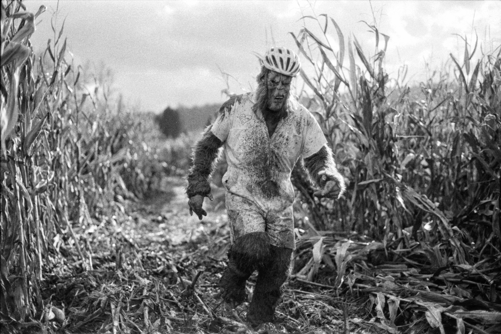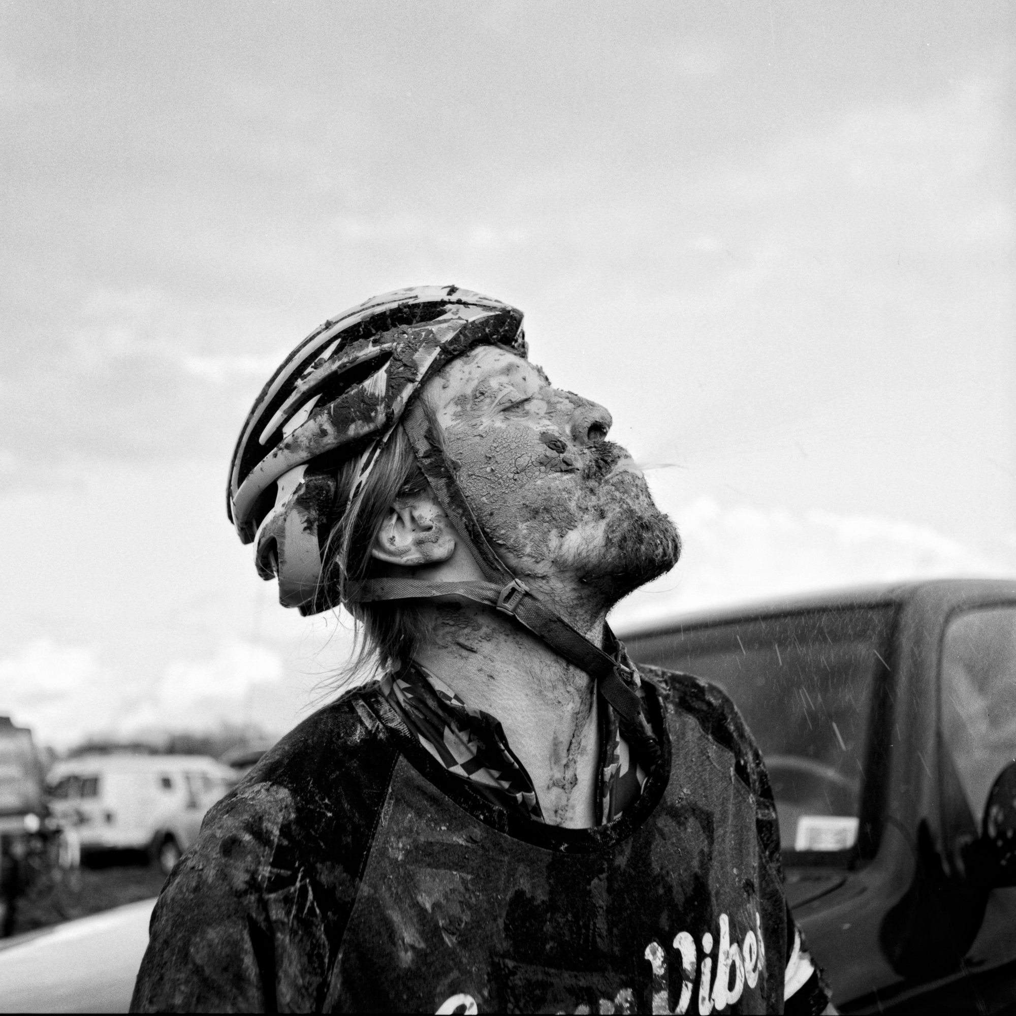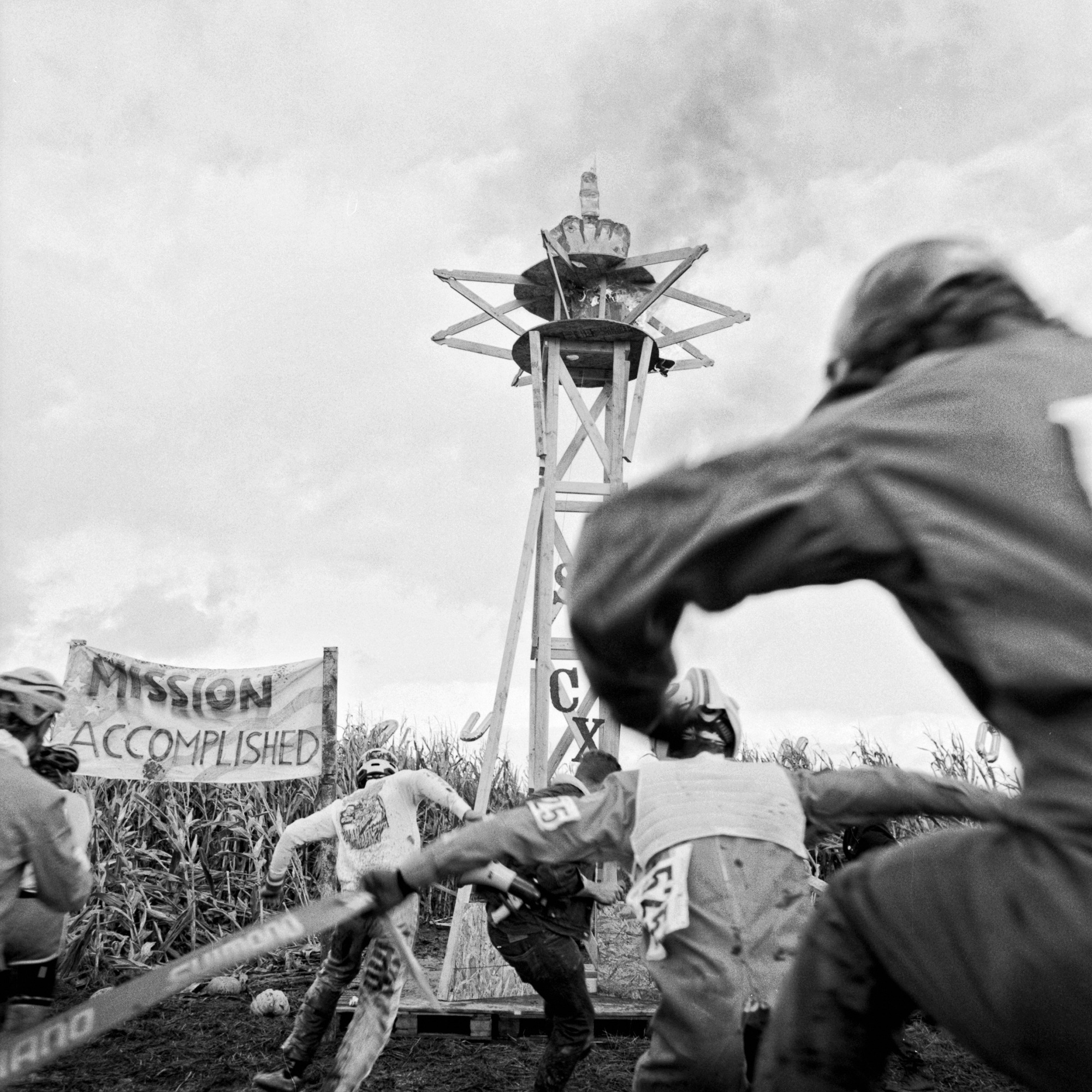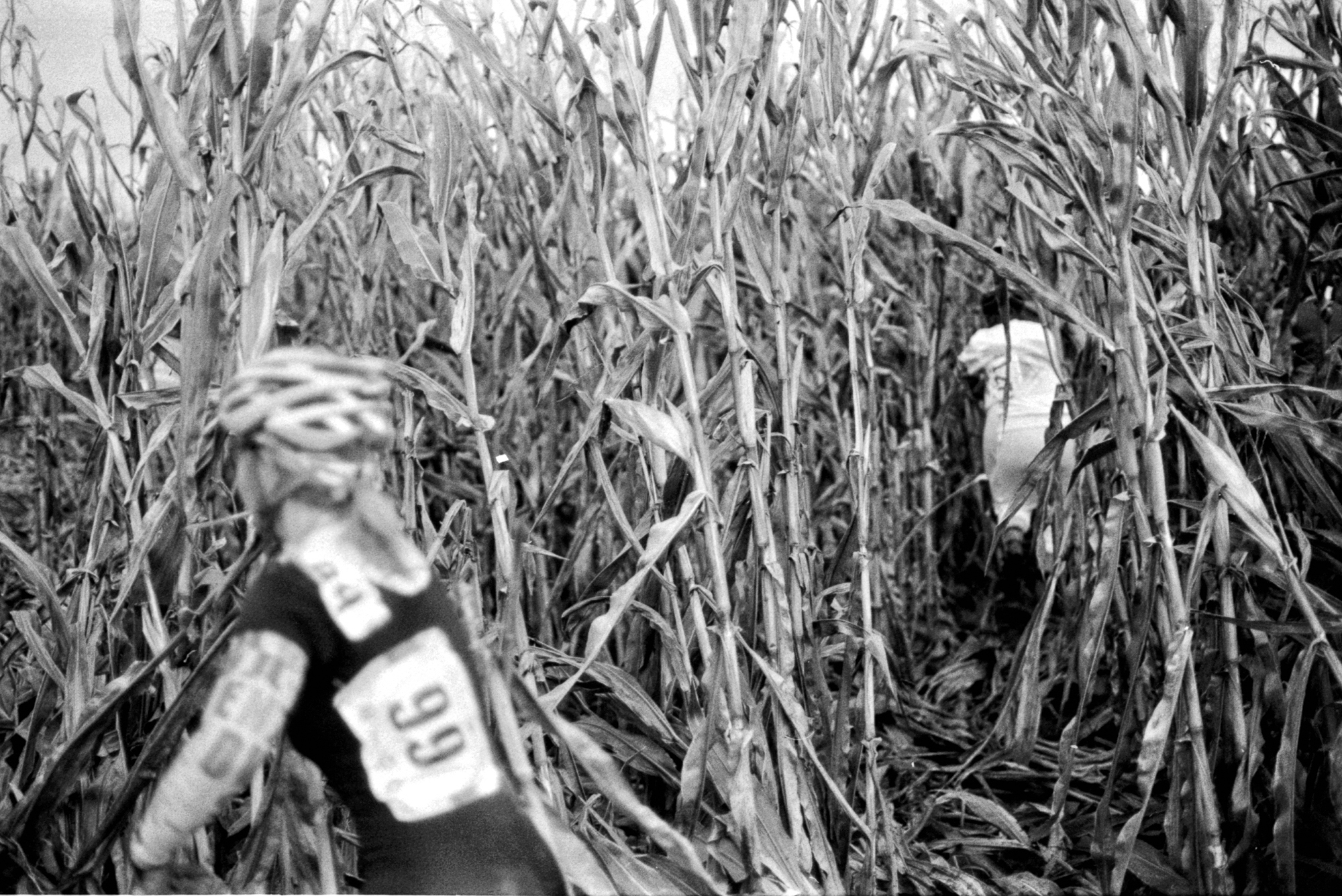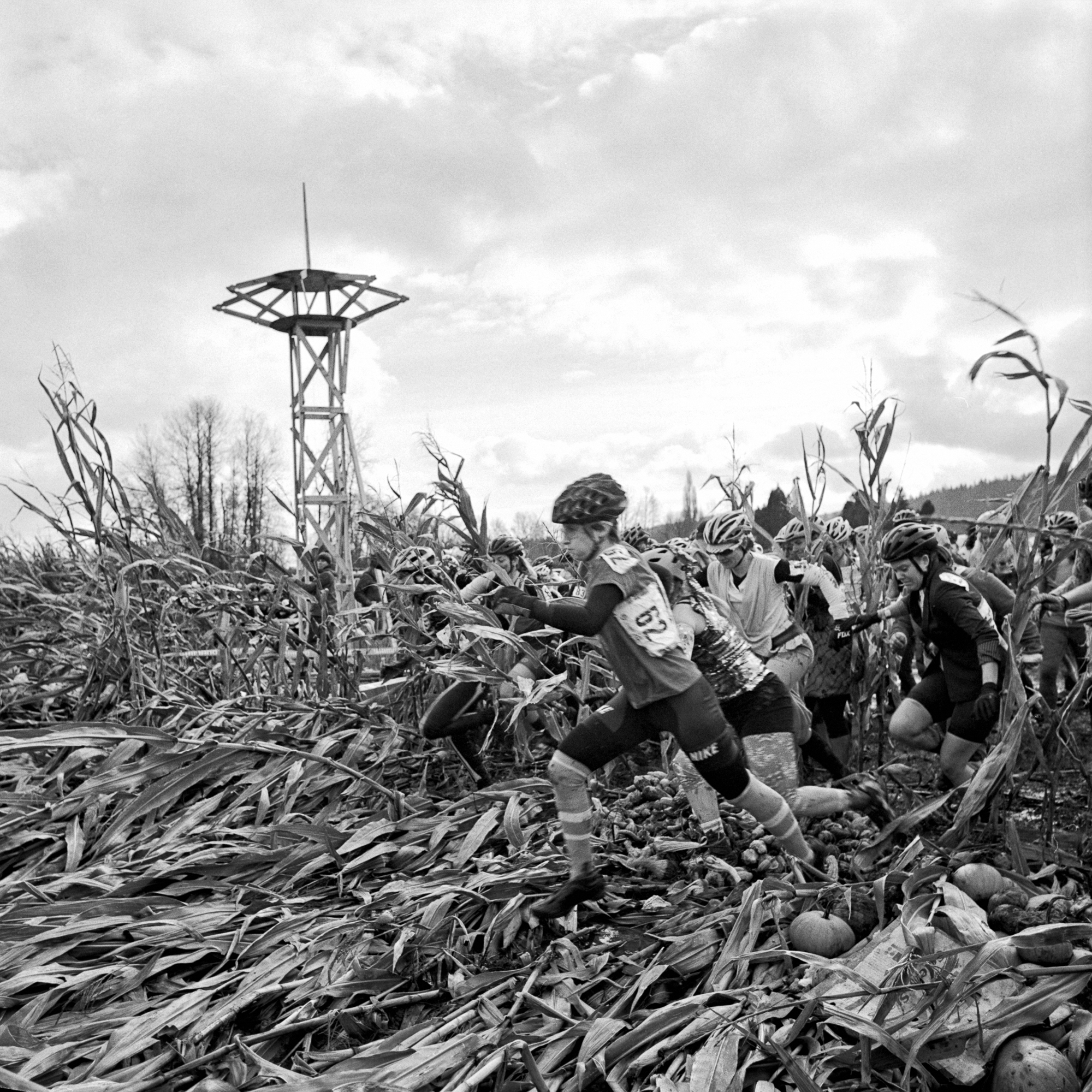 I am chasing after a gorilla in a cornfield trying, among many unknown other things, to capture him like some kind of Sasquatch, trying to keep my Nikon F100 from knocking my teeth out. Seems that wet suit material is great for comfort in a camera strap, but its elasticity while charging through muddy farmland is a bit like a hazardous bungee cord. But mostly I’m trying to maneuver myself and my Hasselblad for at least a couple shots as the racers sprint through a forest of corn, trying to find their bikes and ride into further chaos. I’m beginning to realize that I might be working harder, running with old heavy film equipment through mud in rain boots, than I might be riding through the peanut butter like everyone else.