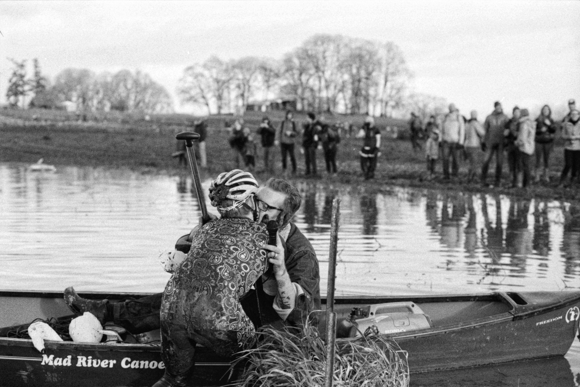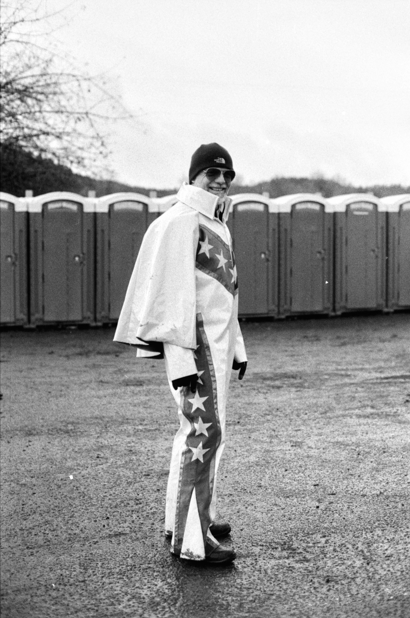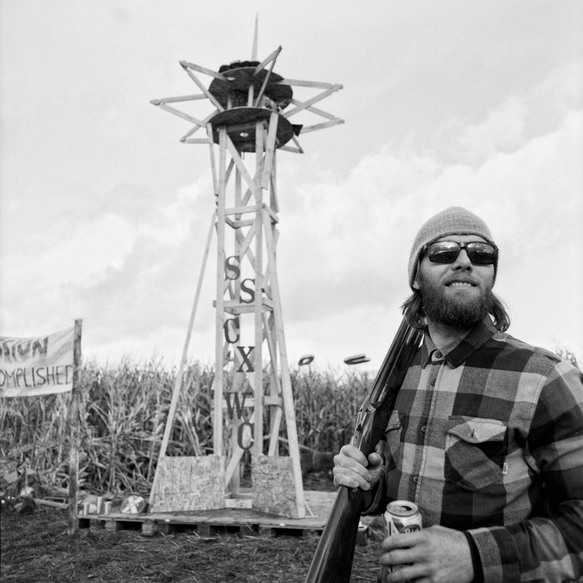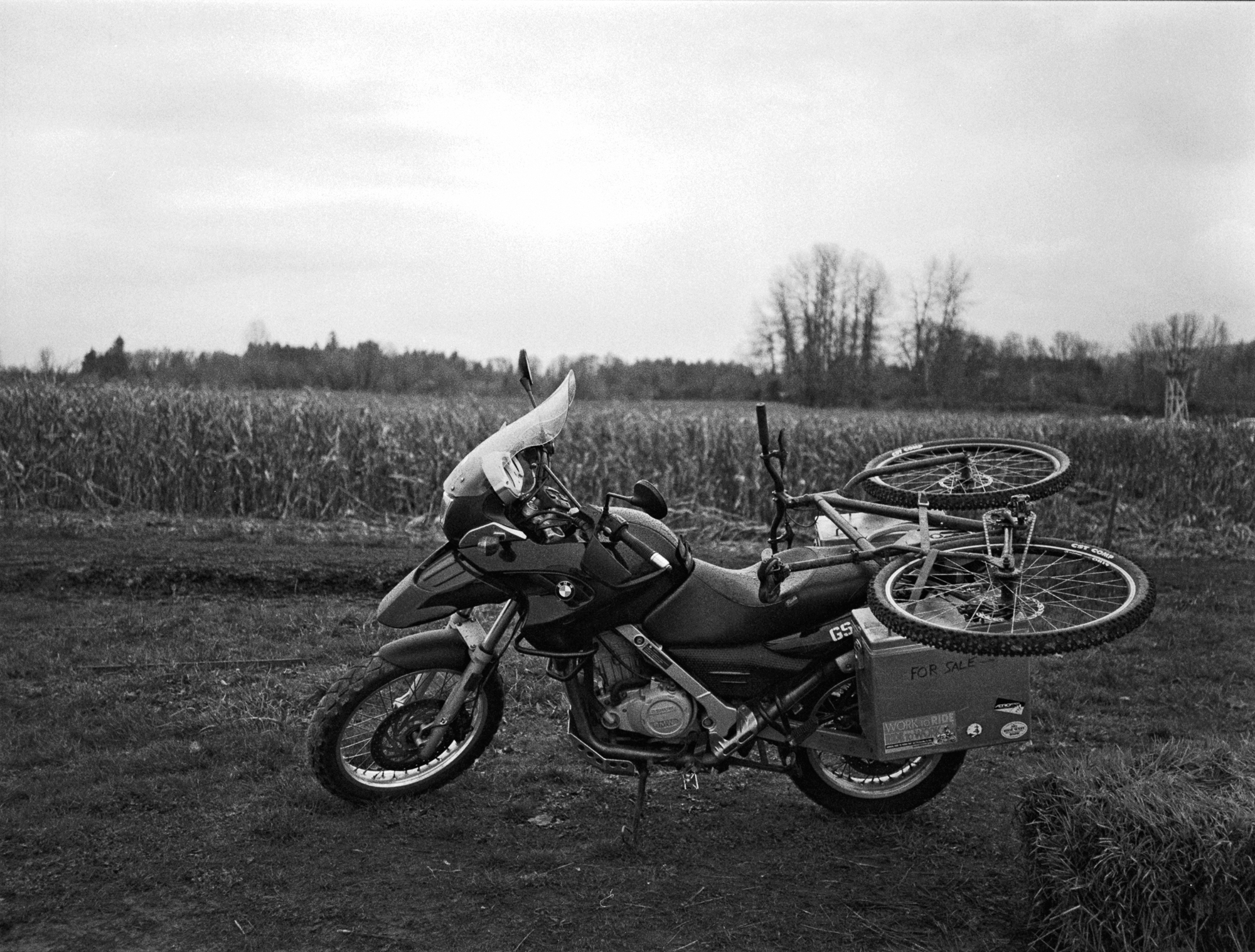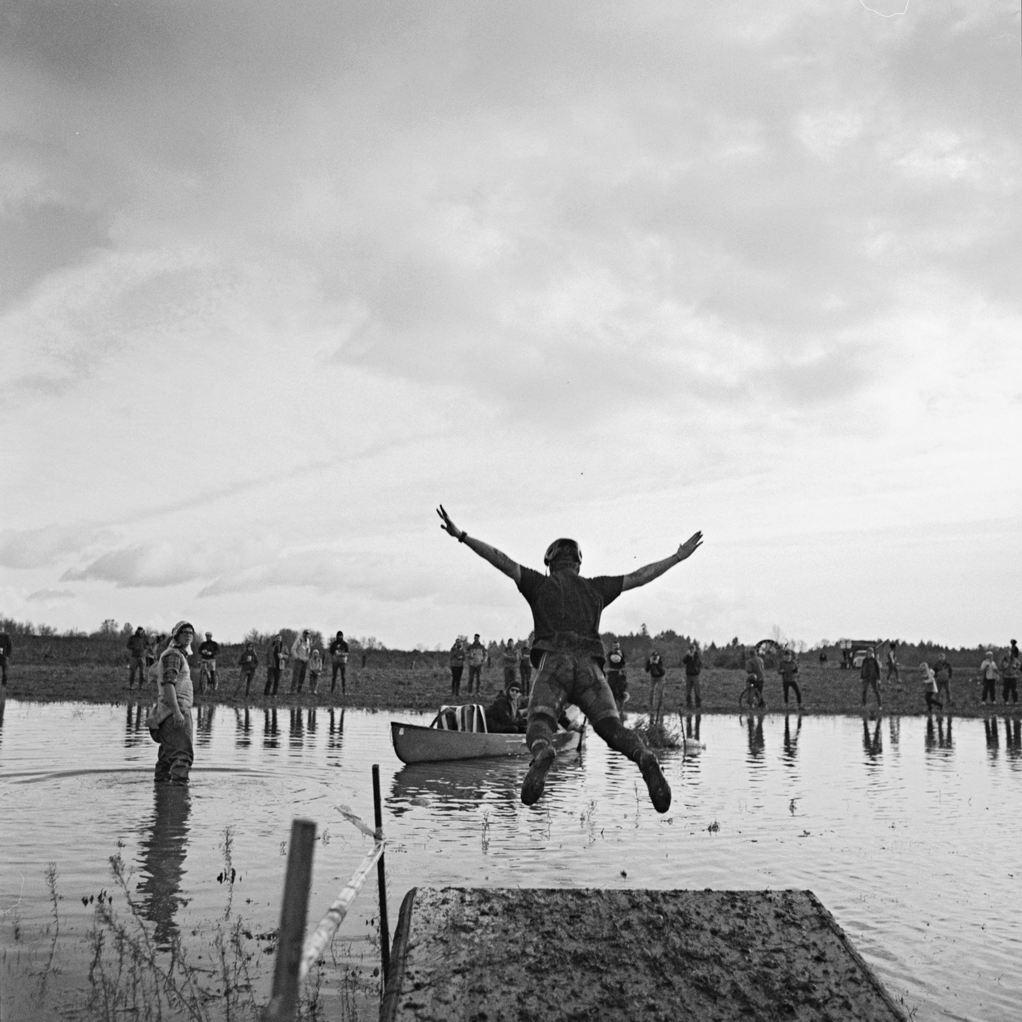 I am chasing after a gorilla in a cornfield trying, among many unknown other things, to capture him like some kind of Sasquatch, trying to keep my Nikon F100 from knocking my teeth out. Seems that wet suit material is great for comfort in a camera strap, but its elasticity while charging through muddy farmland is a bit like a hazardous bungee cord. But mostly I’m trying to maneuver myself and my Hasselblad for at least a couple shots as the racers sprint through a forest of corn, trying to find their bikes and ride into further chaos. I’m beginning to realize that I might be working harder, running with old heavy film equipment through mud in rain boots, than I might be riding through the peanut butter like everyone else.